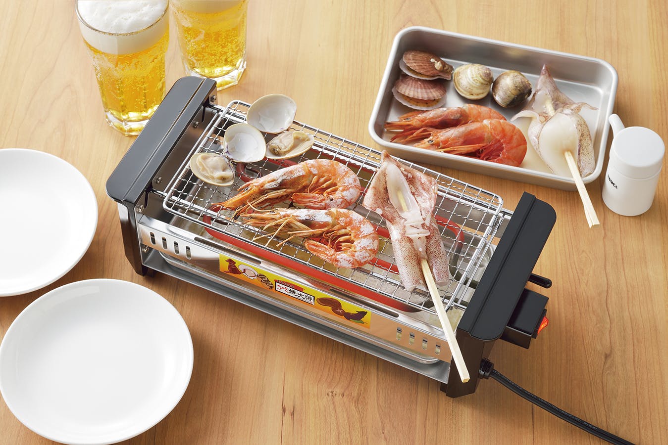 電気ヒーターでじっくり焼くので失敗なく美味しく焼けます。調理済みの焼鳥はもちろん、生肉からでも本格的な美味しい焼鳥が楽しめます。お客さんへのディスプレイ性はもちろん、温め直しやライブ感を愉しんでいただけます。ガスコンロの直火と違い、串が焦げることがなくじっくりと丁寧に焼き上げます。網付で角モチやホタテなどの海産物も調理できるため晩酌のお供にピッタリ。