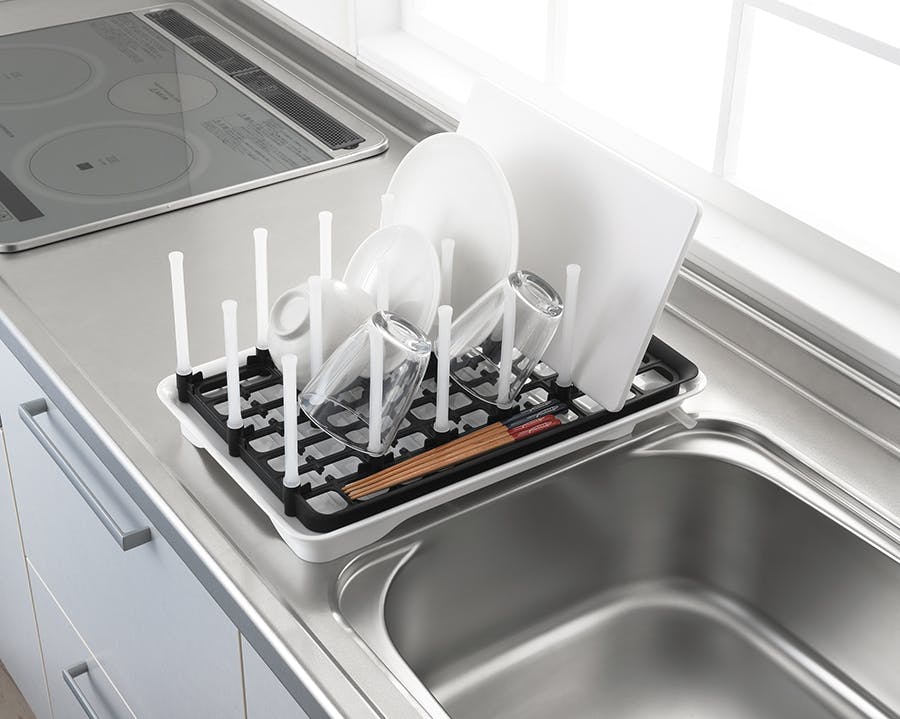 支柱により、コップやボトルなどが安定して立てられ、きれいな水切りができます。支柱を外して洗浄出来る為清潔に使用できます。排水口の向きは自由に変えられます。約280×445×180mm(690g)