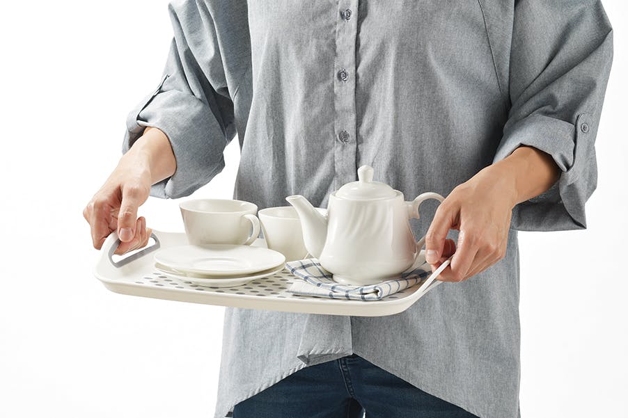 場所を取らない便利な折り畳み式。使わないときは隙間などに立てかけるなどしてコンパクトに収納できます。トレーは滑り止め付で、配膳用のお盆としても使用可能です。展開時:約406×310×128mm(900g)