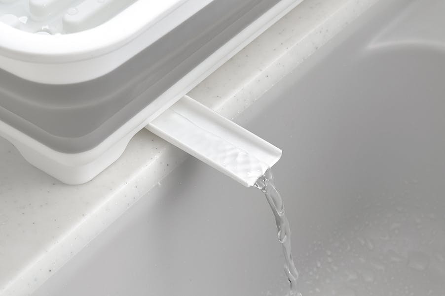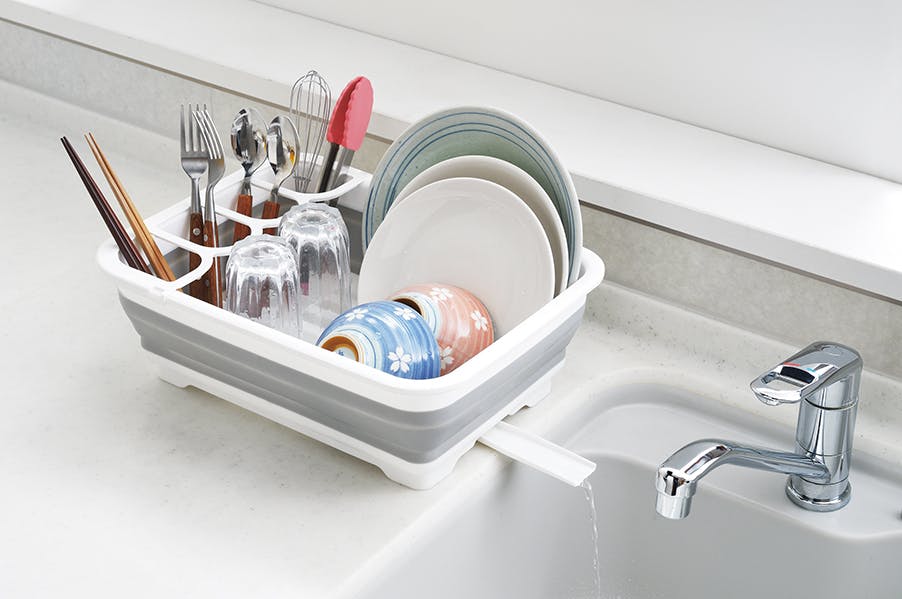 収納時に場所を取らない折り畳みタイプ。深さがあり、皿やコップの転倒の心配が軽減。溝に立てかけて水切りができます。箸やカトラリーを立てておけるスタンドフレーム付。使わない時は幅を取らずにコンパクトに収納できます。排水ノズルでラクラク自動排水できます。約372×275×123mm(555g)