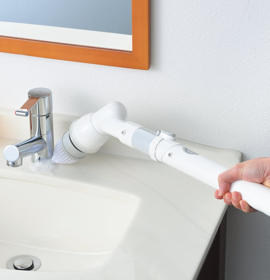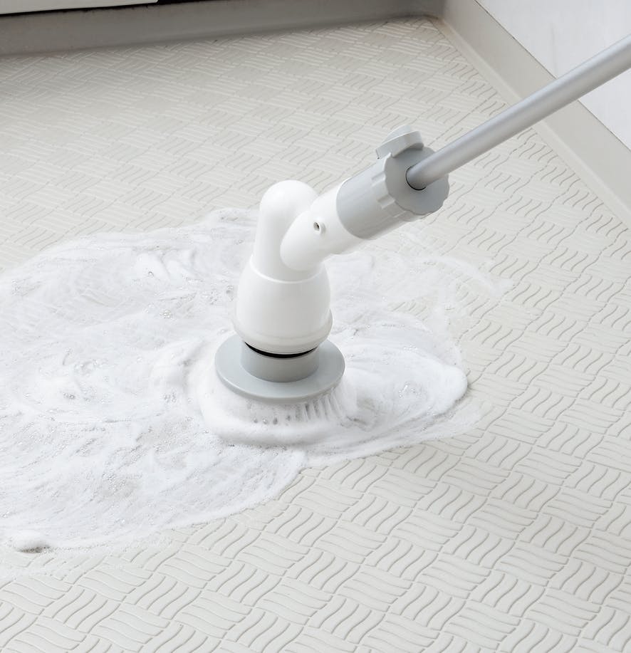 ABS樹脂・アルミニウム・ナイロン、機能:ノズル角度 45°、バッテリー:2,200mAh、回転数:500RPM、バッテリー種類:リチウムイオン、持続時間:40分間、充電時間:3.5~4時間、コードの長さ:約1.1m、付属ブラシ:大円ブラシ・デッキブラシ・コーナーブラシ 中国製