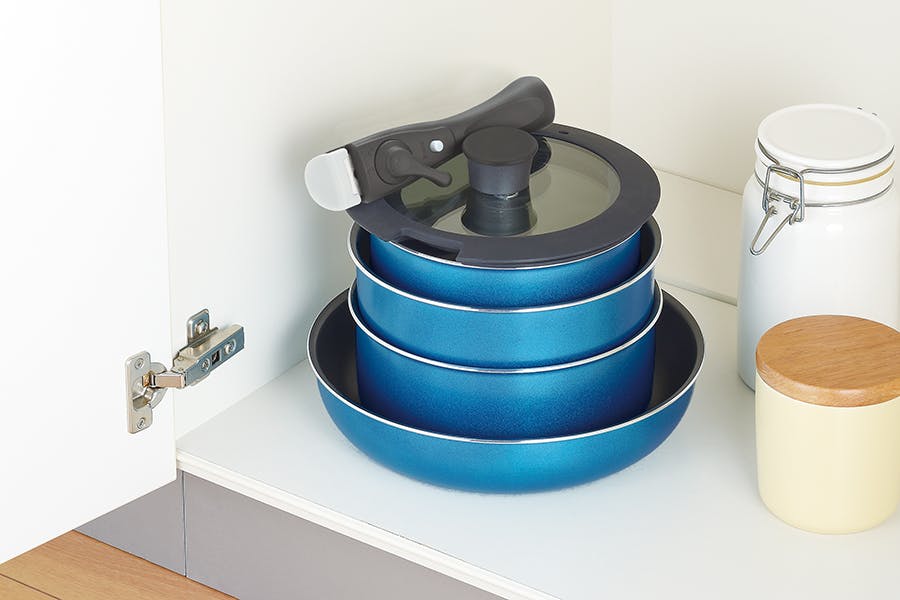 ポット・ディープパン・フライパン、表面加工/内面:フッ素樹脂加工、外面:耐熱焼付け塗装、材料の種類/本体:アルミニウム合金、貼り底:ステンレス鋼(クロム18%)、底の厚さ:2.5mm、着脱ハンドル、材料の種類/鍋押さえ部・スライドボタン部:シリコーンゴム(耐熱温度220℃)、フック部:66ナイロン(耐熱温度180℃)、本体:フェノール樹脂(耐熱温度180℃)、金属部:ステンレス鋼、ガラス蓋、品名/強化ガラス、材料の種類/金属部:ステンレス鋼、摘み部:フェノール樹脂、ゴム部:シリコーンゴム 中国製