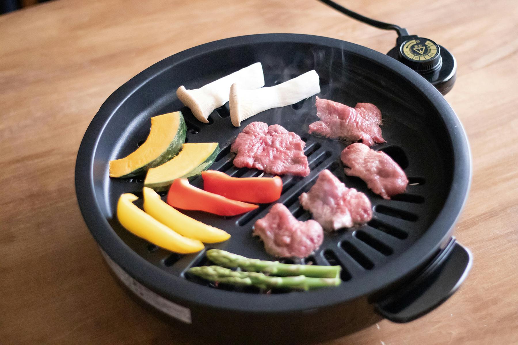 水受皿に脂が落ちて冷やされるため、煙も出にくい構造になっています。プレートはフッ素樹脂加工なので、焦げ付きにくくお手入れ簡単。約355×370×105mm(1900g)