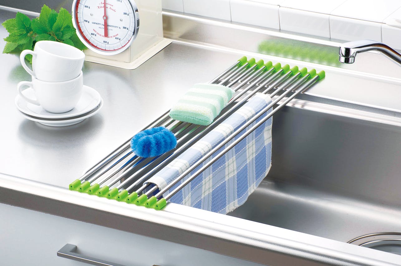使わない時は丸めて収納できるので、場所をとらずコンパクト!水滴はそのままシンクに流れるため衛生的に使えます。ふきんやスポンジ、麺類などの水切りにも便利にご利用いただけます。約570×160×10mm(440g)