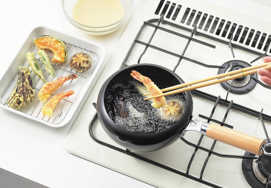 一般的な大きさの天ぷら鍋。油温をコントロールしやすい鉄製。ガード型の本体は揚げ物をする際の油ハネを軽減。保管に便利な蓋付。約390×205×130mm(960g・2.0リットル・適正油量約0.8リットル)深さ:約87mm
