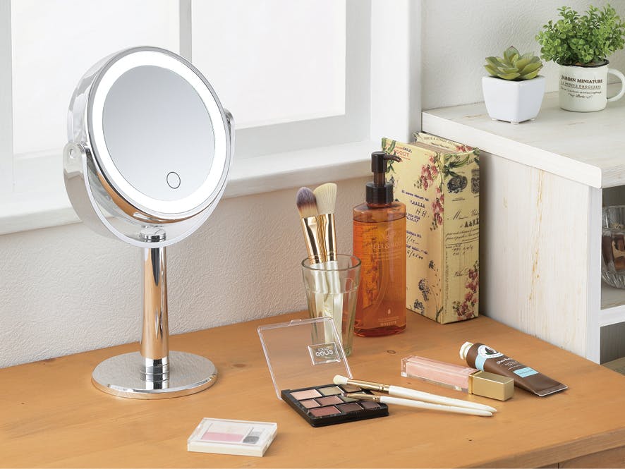LEDが埋め込まれており、明るく照らしてメイクができます。タッチセンサーで点灯。裏面は拡大鏡になっています。約118×184×320mm(約395g)