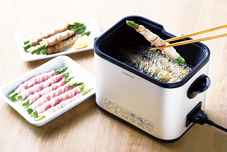 メニューにあった温度調節ができる。油温度調節機能、約160℃から200℃。鍋は、フッ素樹脂加工でお手入れしやすい。保管用蓋付きでほこりが入らず清潔に保管できます。便利で安全なマグネット式コード。約170×300×185mm(1820g・1000ml)