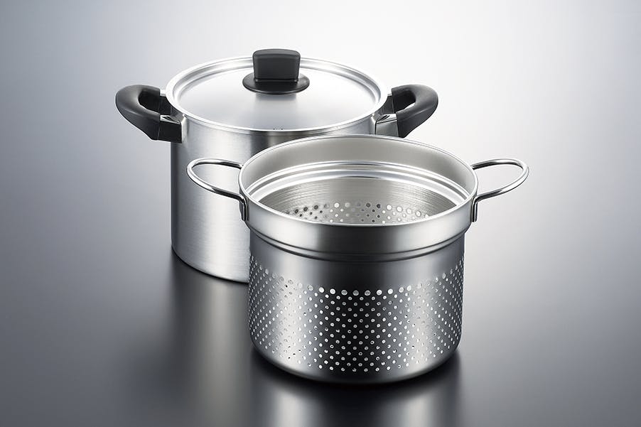 フタは転がりにくいツマミ形状になっているため、お料理の時も安心です。ストレートな形状の本体は大容量。たっぷりのお湯でパスタを茹でられます。カレーやシチューなど煮込み料理にも適します。本体内側には水量が確認しやすい目盛り付。ボイルストレーナー付で、茹であがったパスタの水切りがスムーズに行えます。頑丈なつくりで変形しにくい。