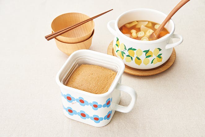 保存容器としてだけでなく、保存したお料理をそのまま加熱して食卓に出すこともできる機能的なアイテム。スープストックや味噌ポットとしても。取っ手付きなので冷蔵庫から取り出しやすい。新潟県燕市でひとつひとつ絵柄を丁寧に手で貼り、仕上げているホーローです。