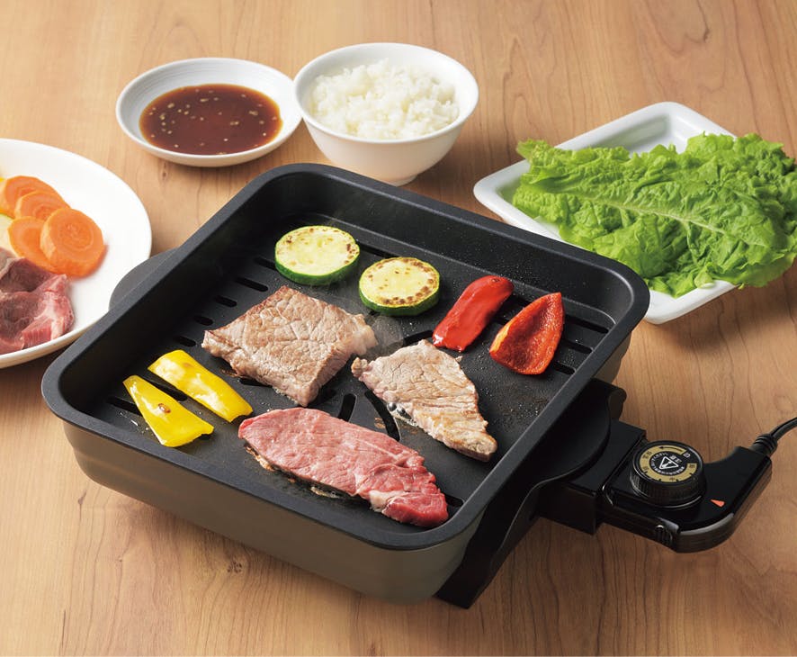 余分な油がプレートから落ちてお肉がヘルシーに焼きあがります。水をはるので煙が出にくい仕様です。約365×265×80mm(約1240g)