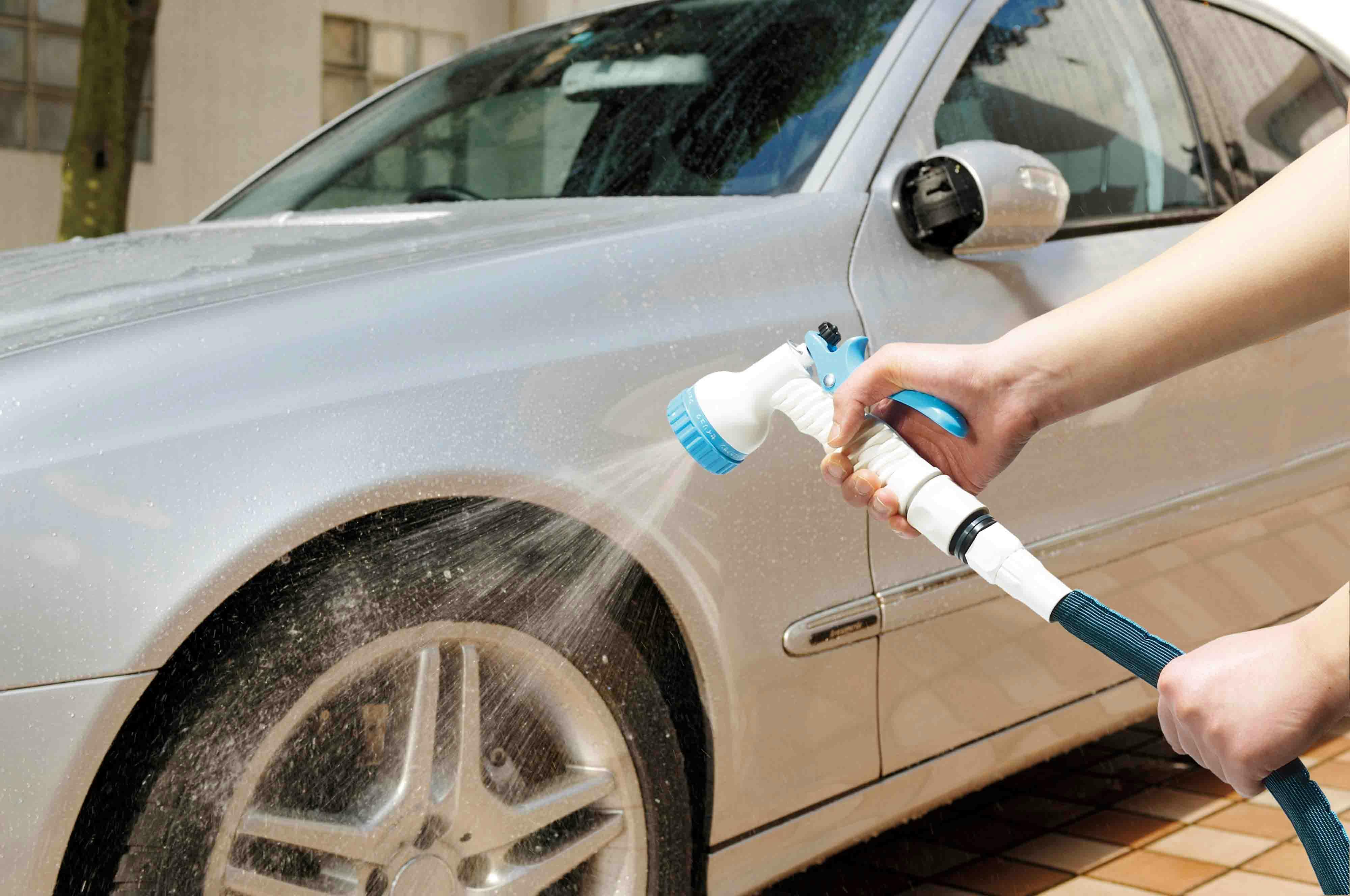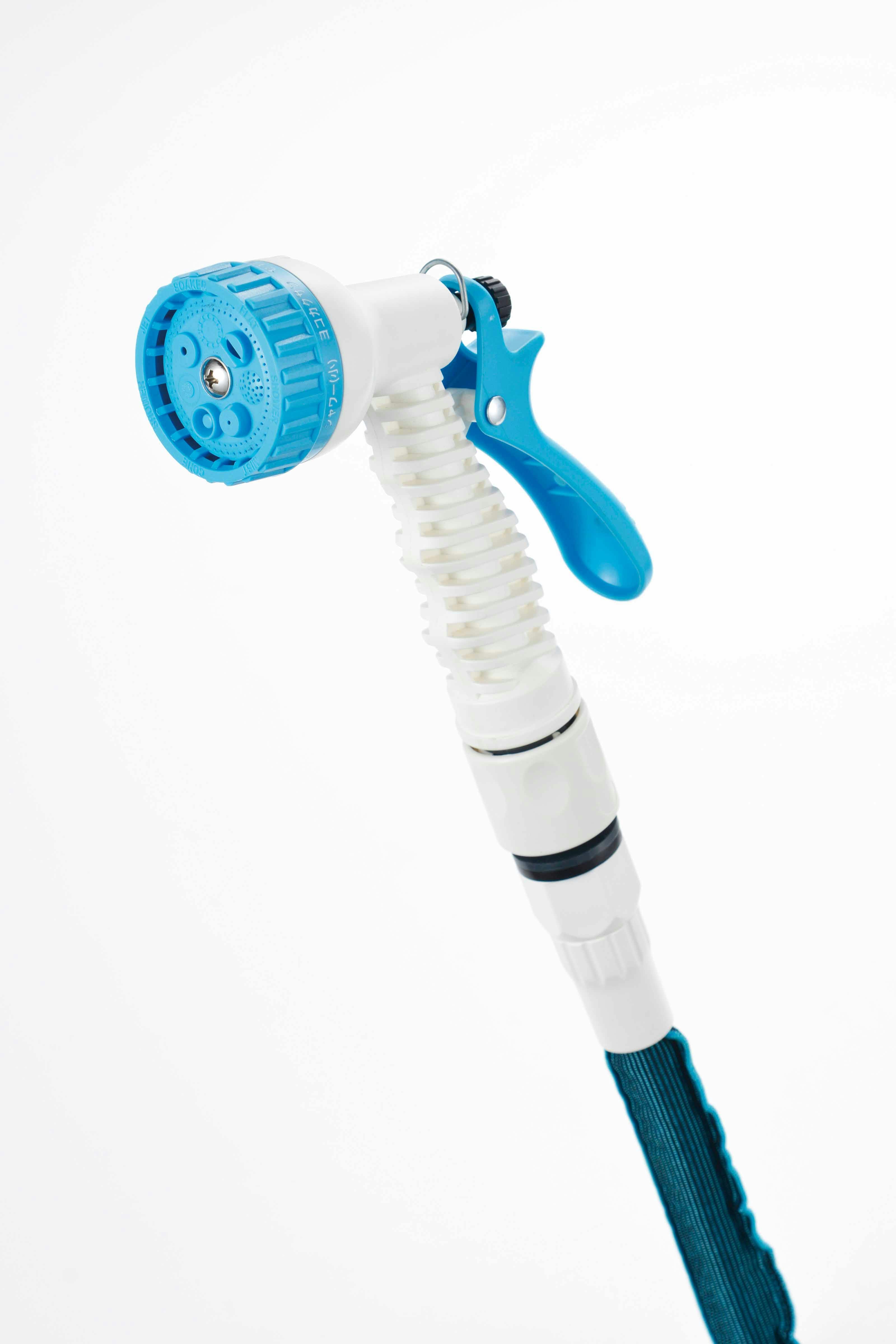 収納時では7.5mで使用時は最大15mまで伸縮します。ノズルは、7段階の使用ができます。収納に便利な蛇口フック付です。