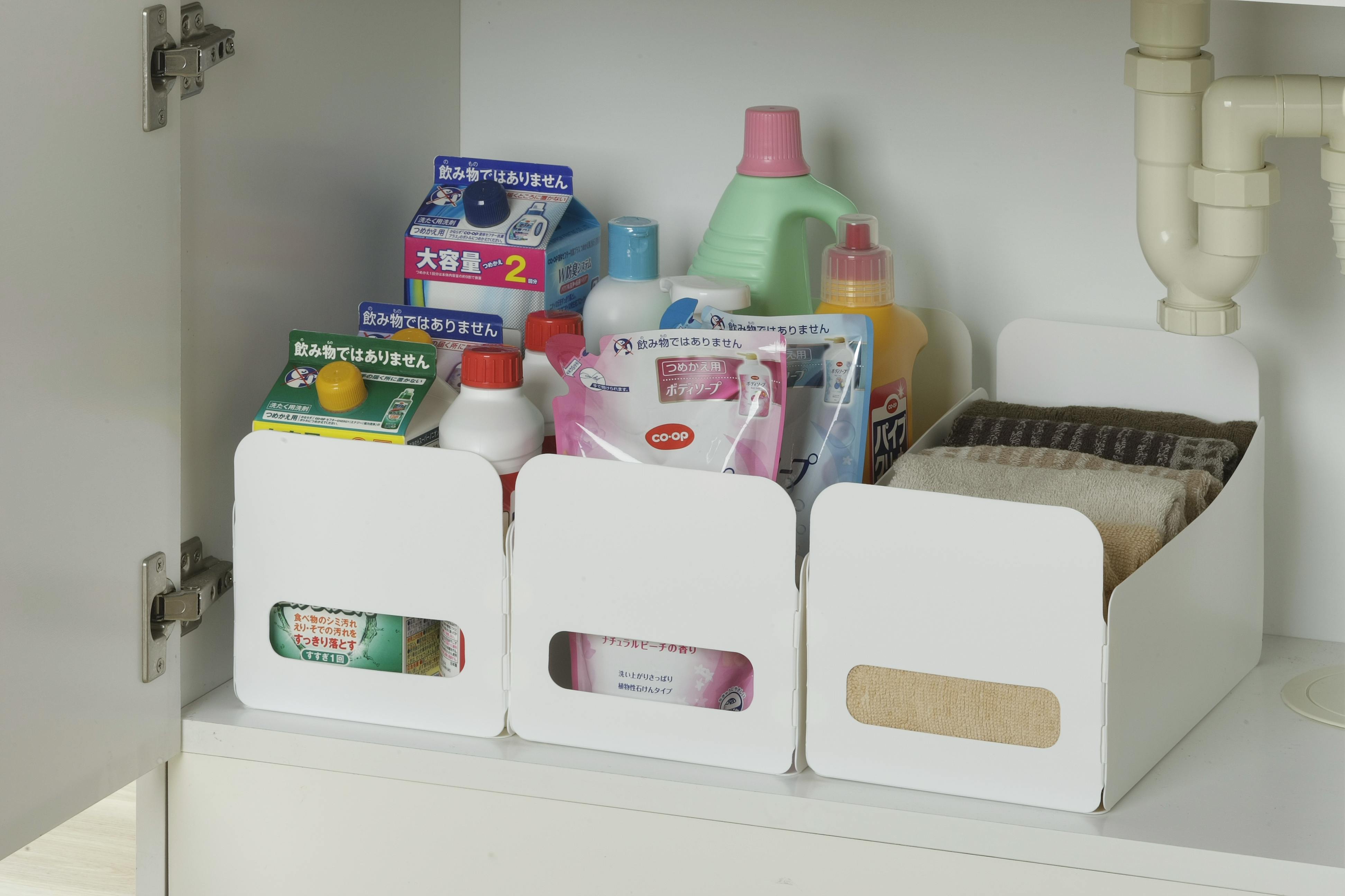 誰でも簡単に組み立てられる収納ボックス。洗面台の下やクローゼットの上など、デッドスペースを有効利用できる収納ボックスです。