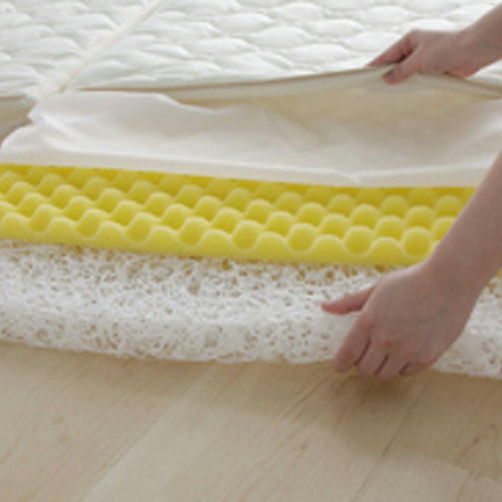 ベッドはもちろん、床に1枚でもお使いいただけるボリュームタイプのマットレスです。エアロキューブRとウレタンフォームの2層構造で、硬さを選べるリバーシブルタイプです。エアロキューブRの反発力とウレタンフォームの柔かさを併せ持ち、しっかりとした寝心地を楽しめます。ウレタンフォームは通気性の良い無膜ウレタン「ムマックR」を使用しています。コンパクトに収納できる三つ折りタイプです。