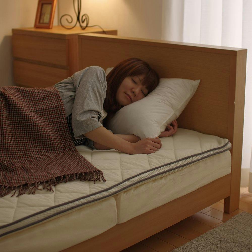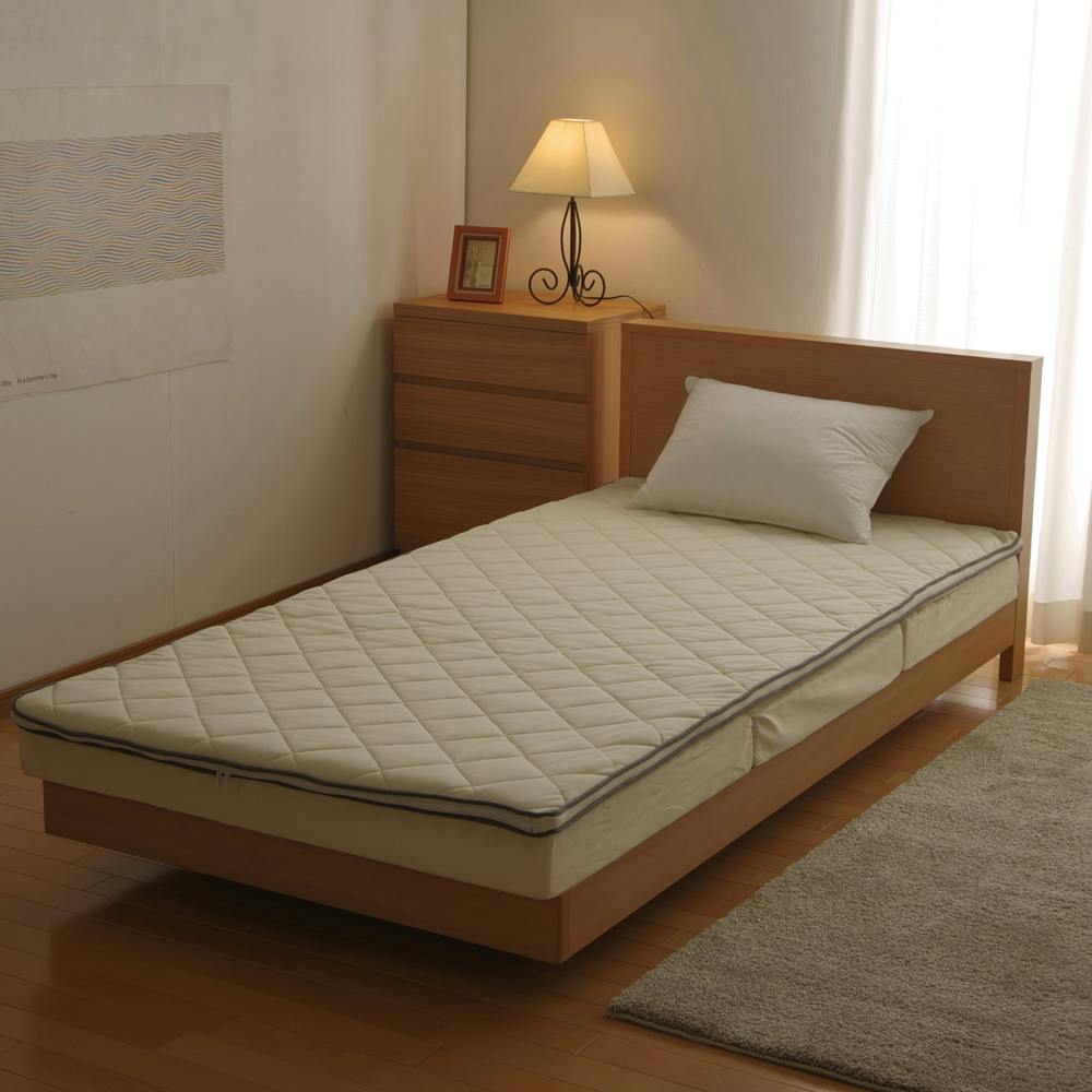 今お使いの布団やマットレスの上に重ねてお使いいただける敷きパッドです。約3cmのエアロキューブRを、表は肌触りのよいニット生地、裏は通気性のよいメッシュ生地で包み込んでいます。冬はニット面、夏はメッシュ面を使うことで1年中快適にご使用いただけます。折り目のない1枚タイプです。 ●目付け(約):ニット生地100g/平方メートル、メッシュ生地200g/平方メートル ●備考:エアロキューブRは東洋紡エムシー株式会社の登録商標です。