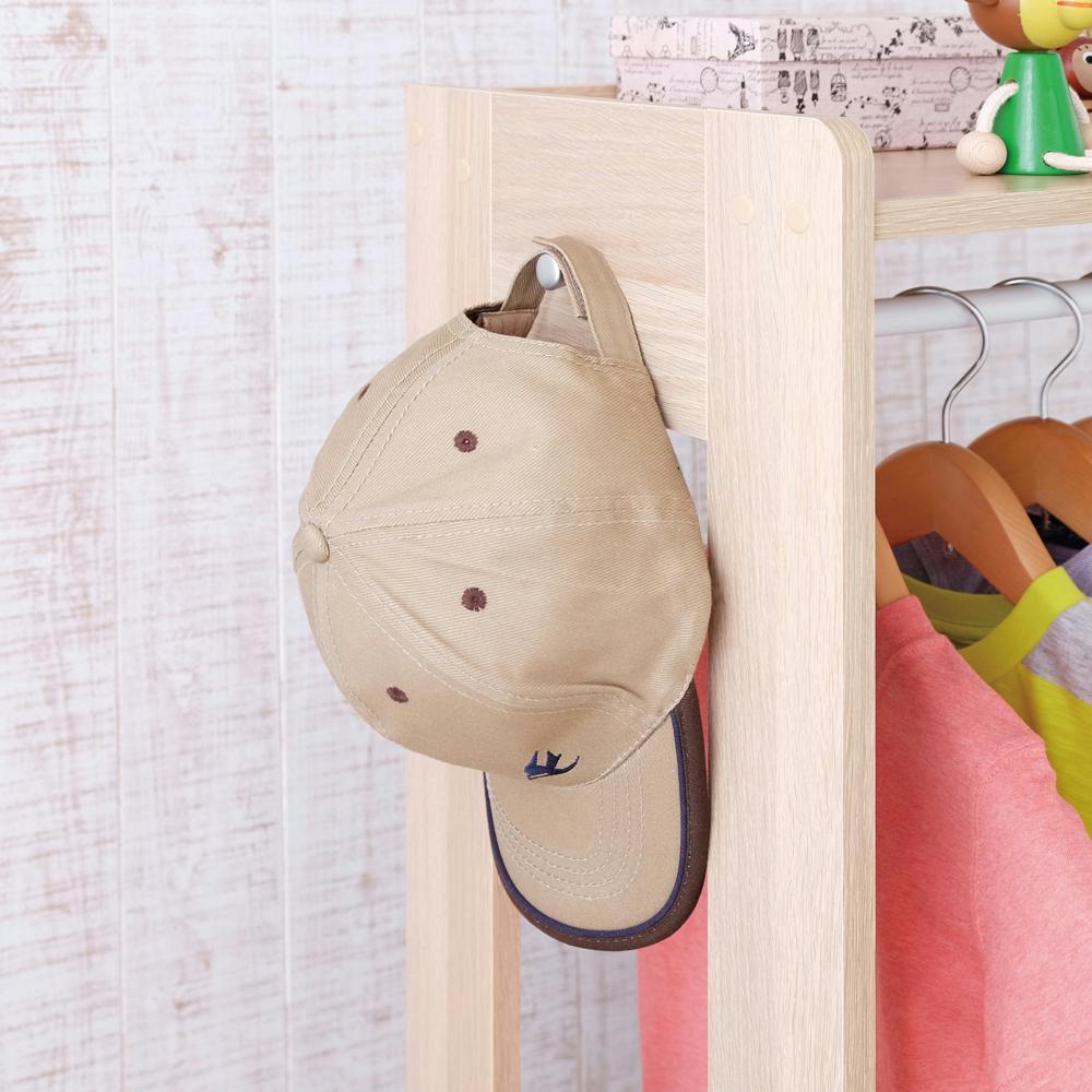 お部屋に合わせて2つのカラーから選べるワードローブです。棚は掛ける衣類に合わせて取り付け位置を3箇所から選べます。天板に物などを置いても取りやすい高さですので効率よく活用いただけます。サイドには掛ける収納用にフックが2個付いており、4箇所の取り付け位置から選べます。 ●耐荷重(約):全体36kg、天板・底板8kg、棚板1枚あたり8kg、ハンガーパイプ10kg、フック1個あたり1kg
