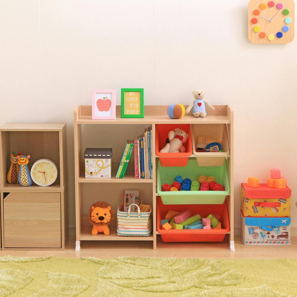 絵本やおもちゃが収納できる本棚付トイハウスラックです。天板付きなので幼稚園バックなどを置くことも、写真立てや雑貨などを置く飾り棚としても活用できます。本棚は2段で、A4サイズの絵本がたくさん収納できます。ケースは色分けされているので、「どこに何を片付ける」のルールが決めやすく、お子様の自立心をサポートし、楽しくお片付けができます。安全性を考慮した前倒れ防止脚パーツ付きです。簡単組立で小さなお子様のいるご家庭でも隙間時間で組み立て可能です。