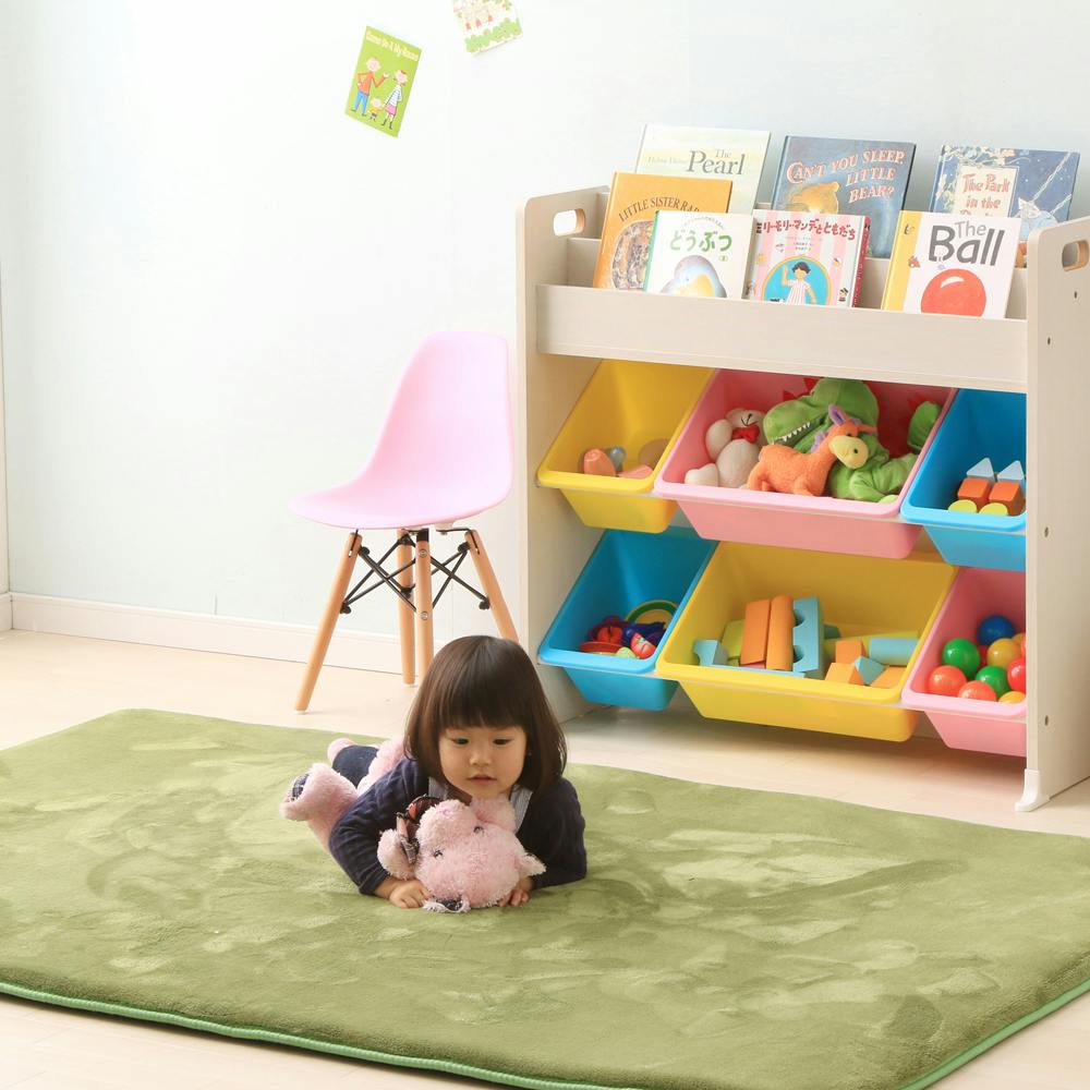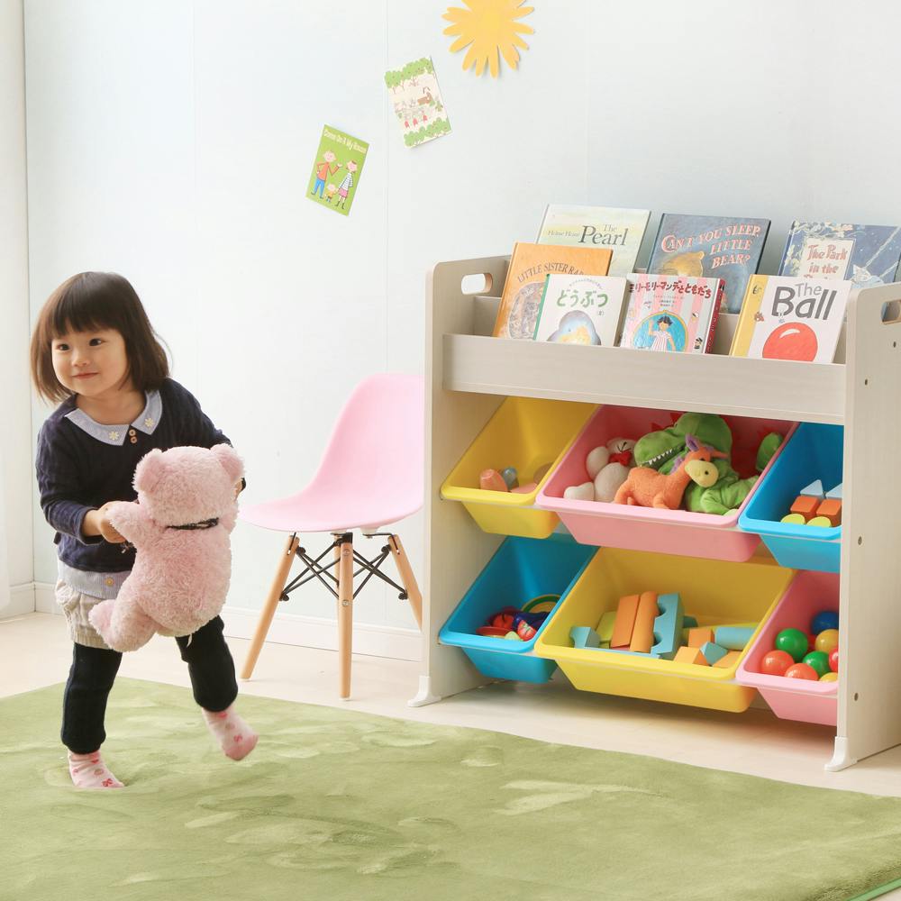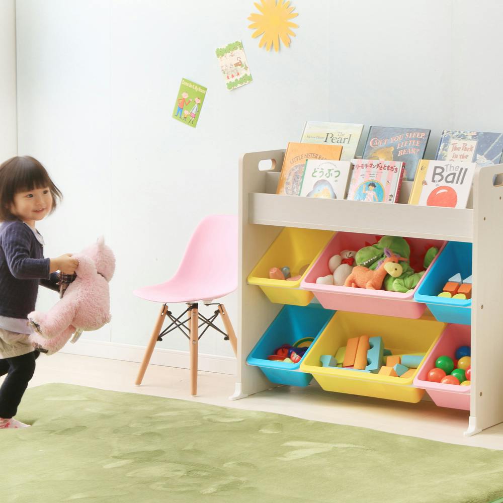絵本やおもちゃが収納できる絵本棚付トイハウスラックです。絵本棚は2段で表紙を見せて収納できるので、見たい本をすぐ取り出せます。ケースは色分けされているので、「どこに何を片付ける」のルールが決めやすく、お子様の自立心をサポートし、楽しくお片付けができます。安全性を考慮した前倒れ防止脚パーツ付きです。簡単組立で小さなお子様のいるご家庭でも隙間時間で組み立て可能です。