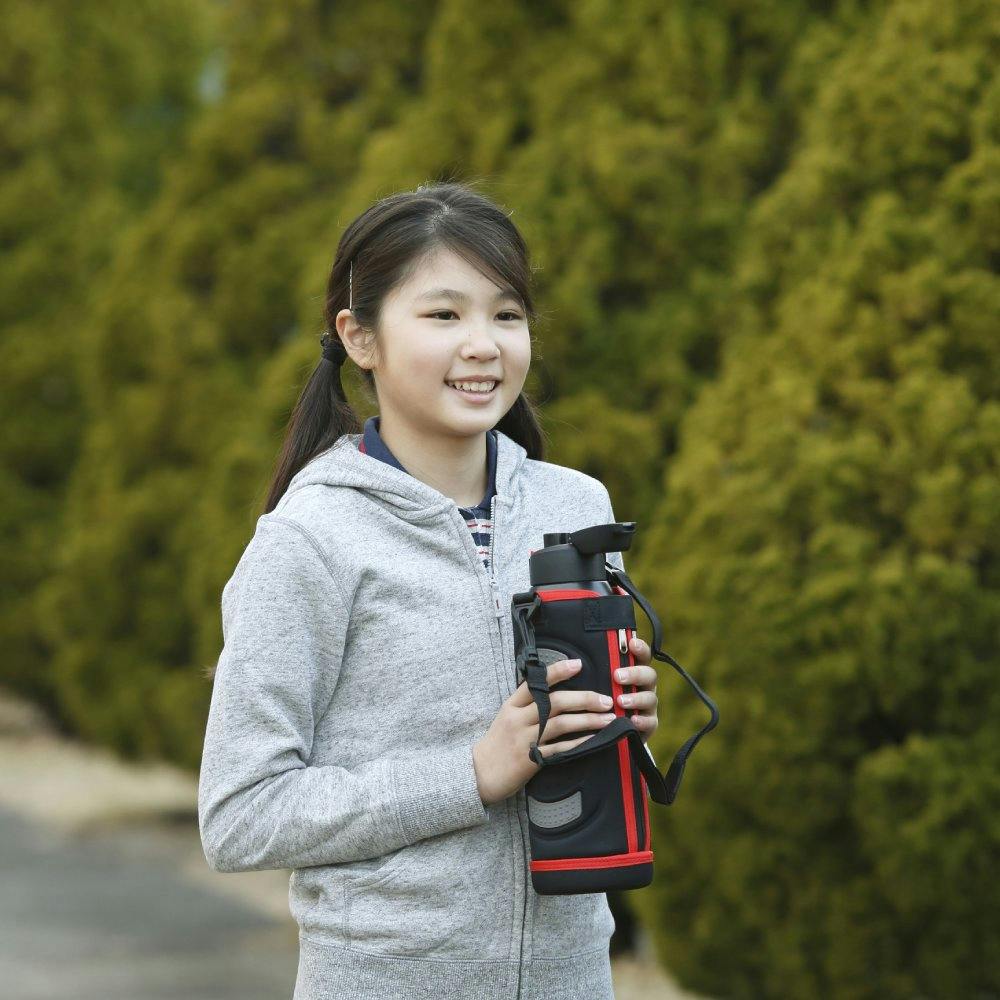 そのまま飲める直飲みタイプで、スポーツ時などの水分補給に最適なダイレクトボトルです。真空二重構造のため、冷たさを保ち、飲み物を保冷できます。口径50mmで、大きな氷もラクラク入ります。ロックを解除し、ワンタッチオープンで簡単に蓋を開けることができます。肩から掛けられるストラップ付きポーチが付属されており、持ち運びに便利です。ポーチは衝撃に強い底面設計です。スペアパッキンが1組付いているため、汚れたり破損した際にすぐに交換することができます。保冷専用です。