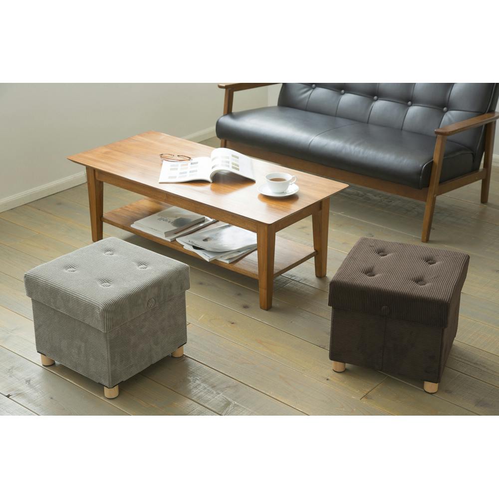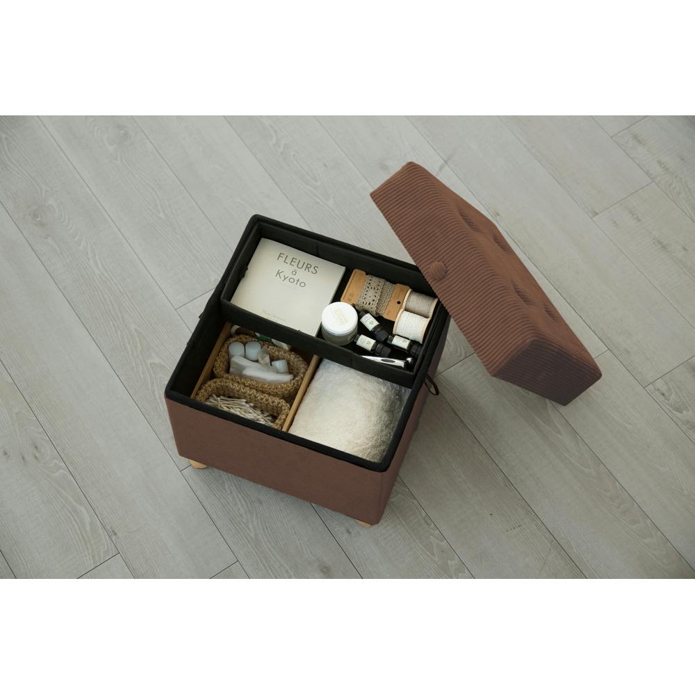 1台4役の多機能収納スツールです。イスとしての使用はもちろん、オットマンとしてもお使いいただけます。座面を裏返すと、簡易テーブルになり、ゴムで座面を固定することで、安定してお使いいただけます。脚付きデザインで、フローリングの部屋や木製家具とも相性抜群です。コンパクトに折りたためます。小物の収納に便利なインナーBOX付きです。ソファやチェアで人気のコーデュロイ生地を採用しています。