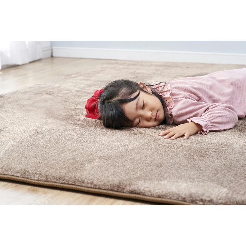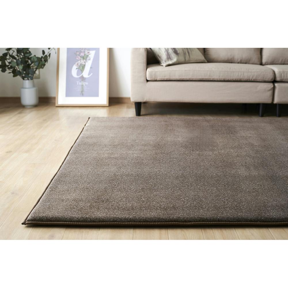 ウレタンの厚さが30mmの厚手タイプで、底つき感を感じさせないボリュームのあるラグです。抜染により、深みのある色合いが魅力のラグです。床の冷たさを軽減し冬は暖かく、また毛足が短くさらっとした触り心地で夏も気持ちよく、オールシーズン使用できます。厚手のウレタンなので、防音効果もあります。お子様やペットのいるご家庭、集合住宅の騒音対策にもぴったりです。裏面にすべり止め加工を施しているため、ラグがずれにくく安心してお使いいただけます。