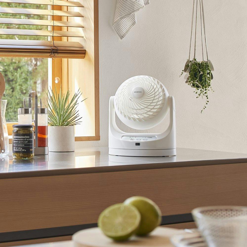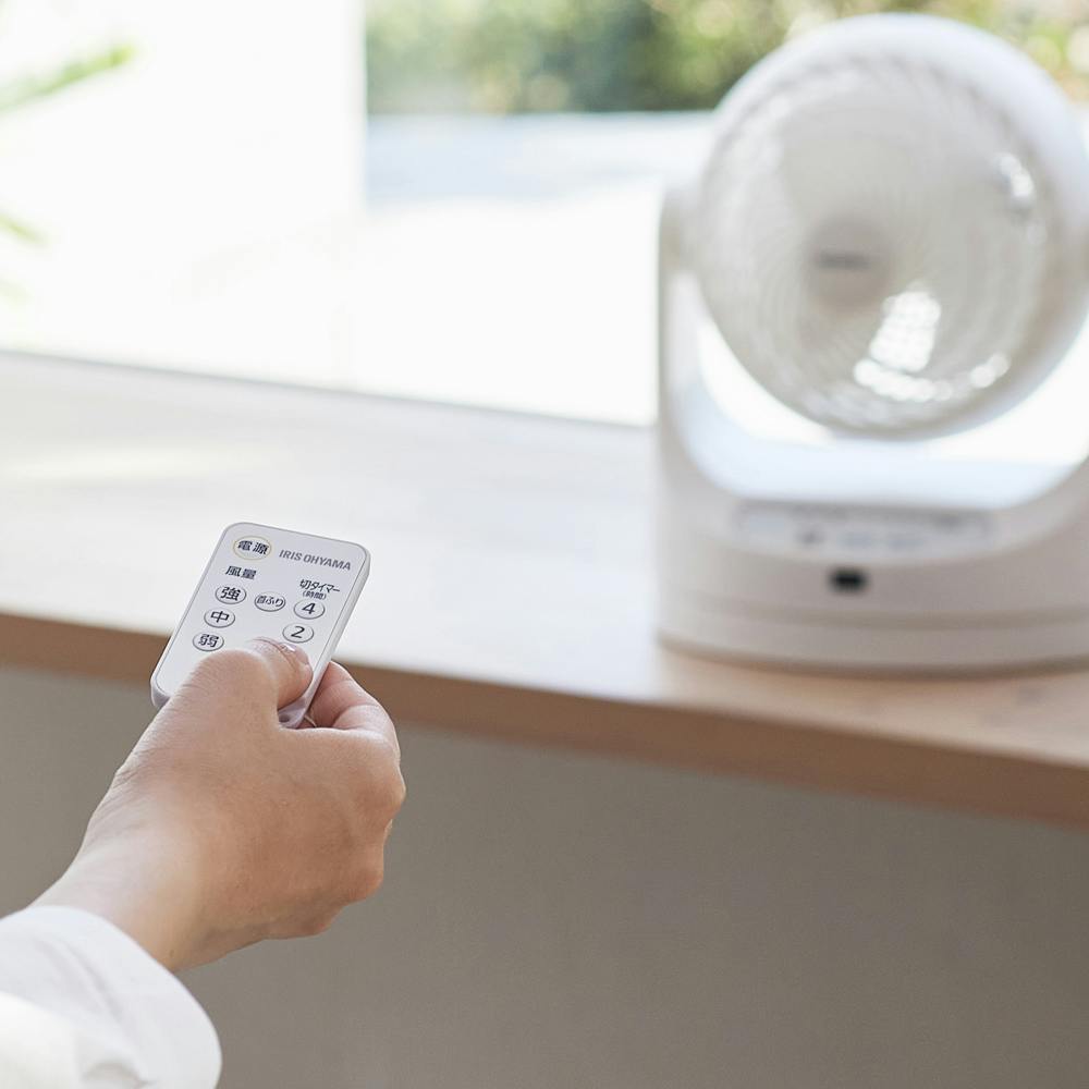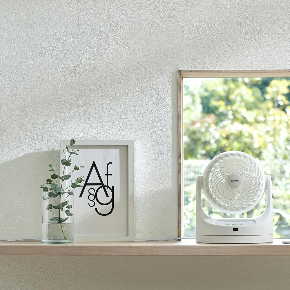 離れた場所からでも操作できるリモコン付きです。エアコンと併用して夏は冷気を部屋全体へ、冬は暖かい空気を足元へ循環し一年中使えます。室内の空気の循環以外に、洗濯物の乾燥、部屋の換気、隣室への空気の送り込みなどに使うこともできます。 これまでのH型サーキュレーターよりデザイン性・質感がUP!!サーキュレーター部分が丸いフォルムで、圧迫感のないコンパクトサイズになりました。