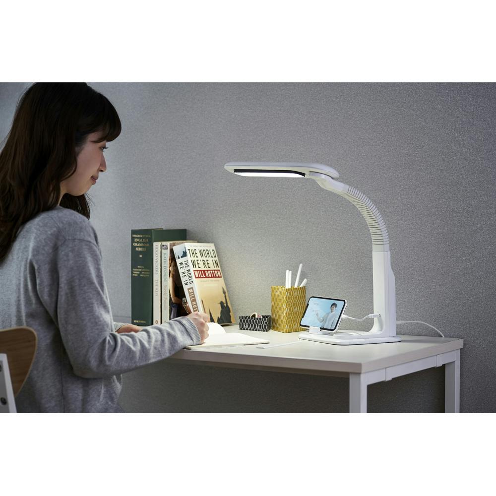 携帯やタブレットを充電しながら使える、USB給電付きLEDデスクライトです。マグネット式で位置の変えられるスマホスタンド付きで、スマホを活用した学習時に便利です。「まぶしさガード」採用で、手元は明るく、光源はまぶしくない、目にやさしい設計です。明るさは無段階調節で調光ができ、デスク学習などに適切な明るさをご提供します。ベース部分は取り外しができ、右利き左利きどちらでも使いやすいように変えられます。