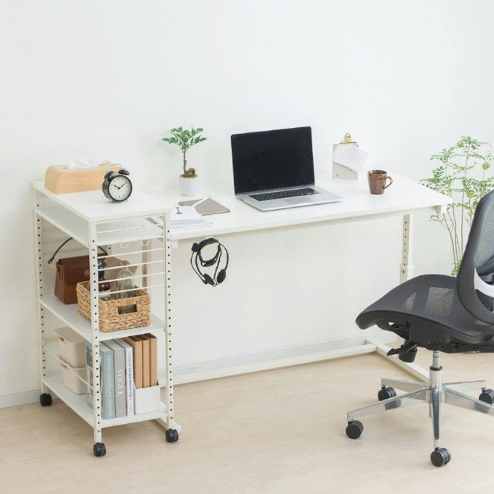 デスクの横に置いて使用できるデスクサイドワゴンです。昇降デスクと組み合わせてさらに便利に使用できます。棚板は使用用途に合わせて30mmピッチで可動可能です。ヘッドセットを掛けたり、色々な用途に使用できるS字フック付です。天板にはメラミンを採用、水も熱もOKなのでコーヒーカップなども安心して置くことができます。