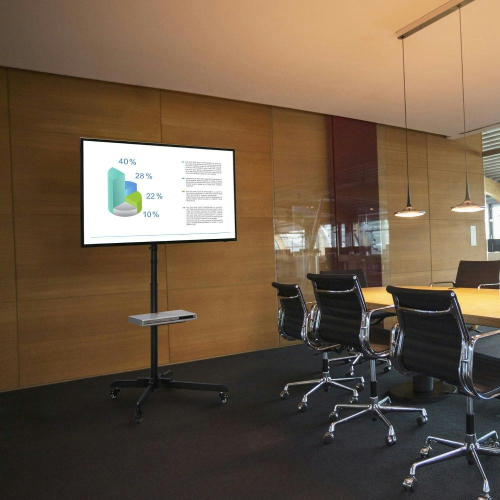 会議を行う仕事場や、学校・塾などの教育現場に最適なディスプレイスタンドです。最大40kgまでのディスプレイを取り付けることができます。使用シーンに合わせて見やすい角度に調整可能です。固定棚にパソコンや周辺機器を置いて、スッキリ収納できます。楽に移動ができるキャスター付です。 最大40kgまでのディスプレイを取り付けることができます。