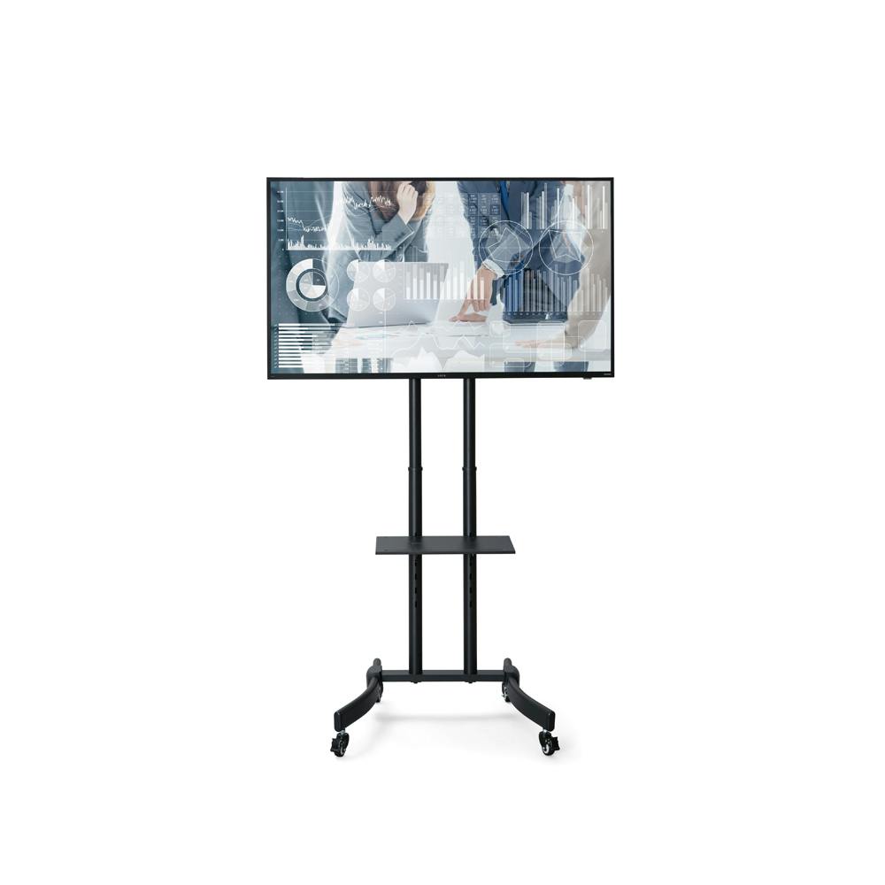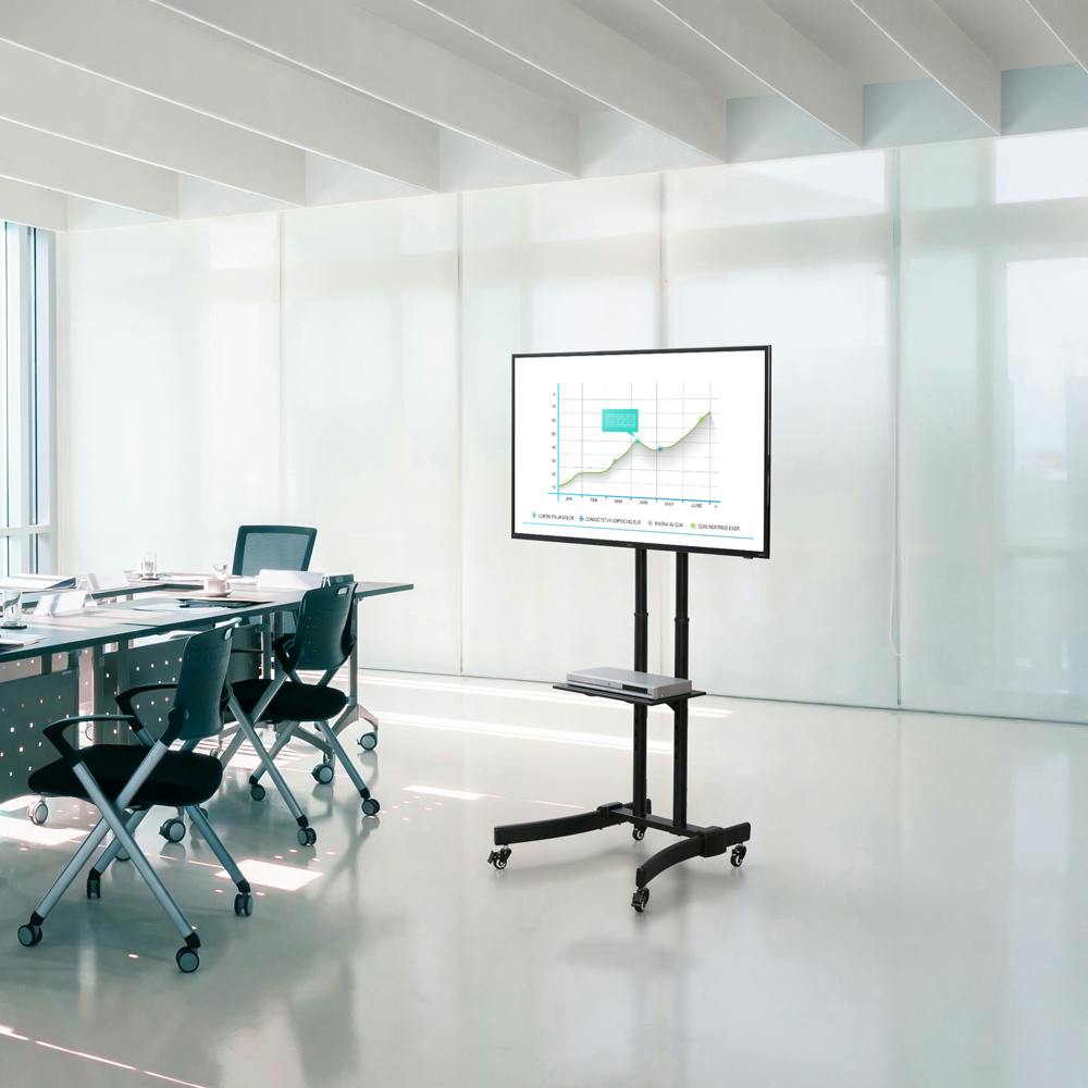 会議を行う仕事場や、学校・塾などの教育現場に最適なディスプレイスタンドです。最大40kgまでのディスプレイを取り付けることができます。使用シーンに合わせて見やすい角度に調整可能です。固定棚にパソコンや周辺機器を置いて、スッキリ収納できます。楽に移動ができるキャスター付です。 最大40kgまでのディスプレイを取り付けることができます。