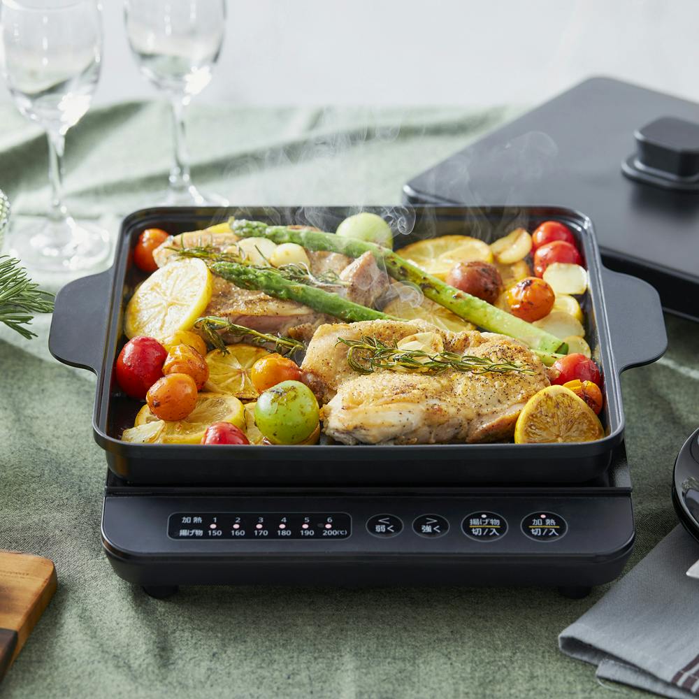 ●表面加工:セラミックコーティング(内側)、焼付塗装加工(外側) ●底の厚さ:6.5mm(貼り底を含む) ●平面プレートのみサイズ・重量(フタなし):W340×D280×H34mm・1200g