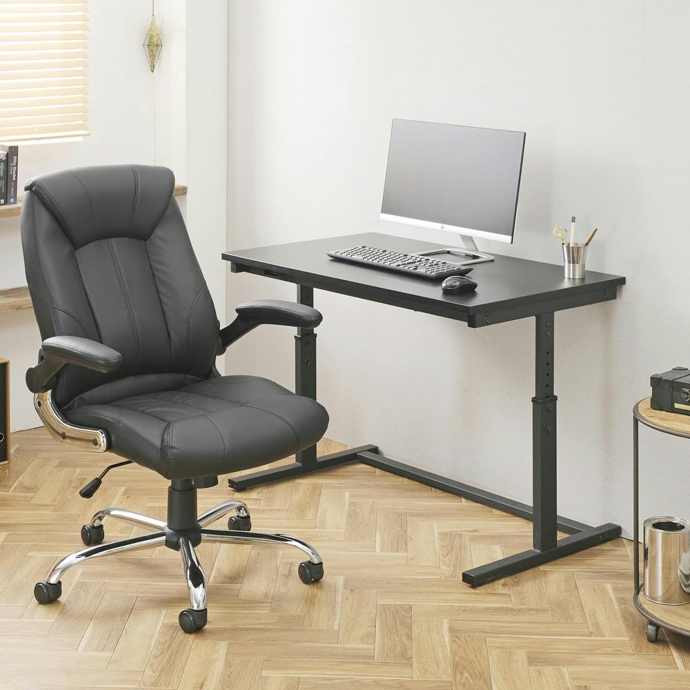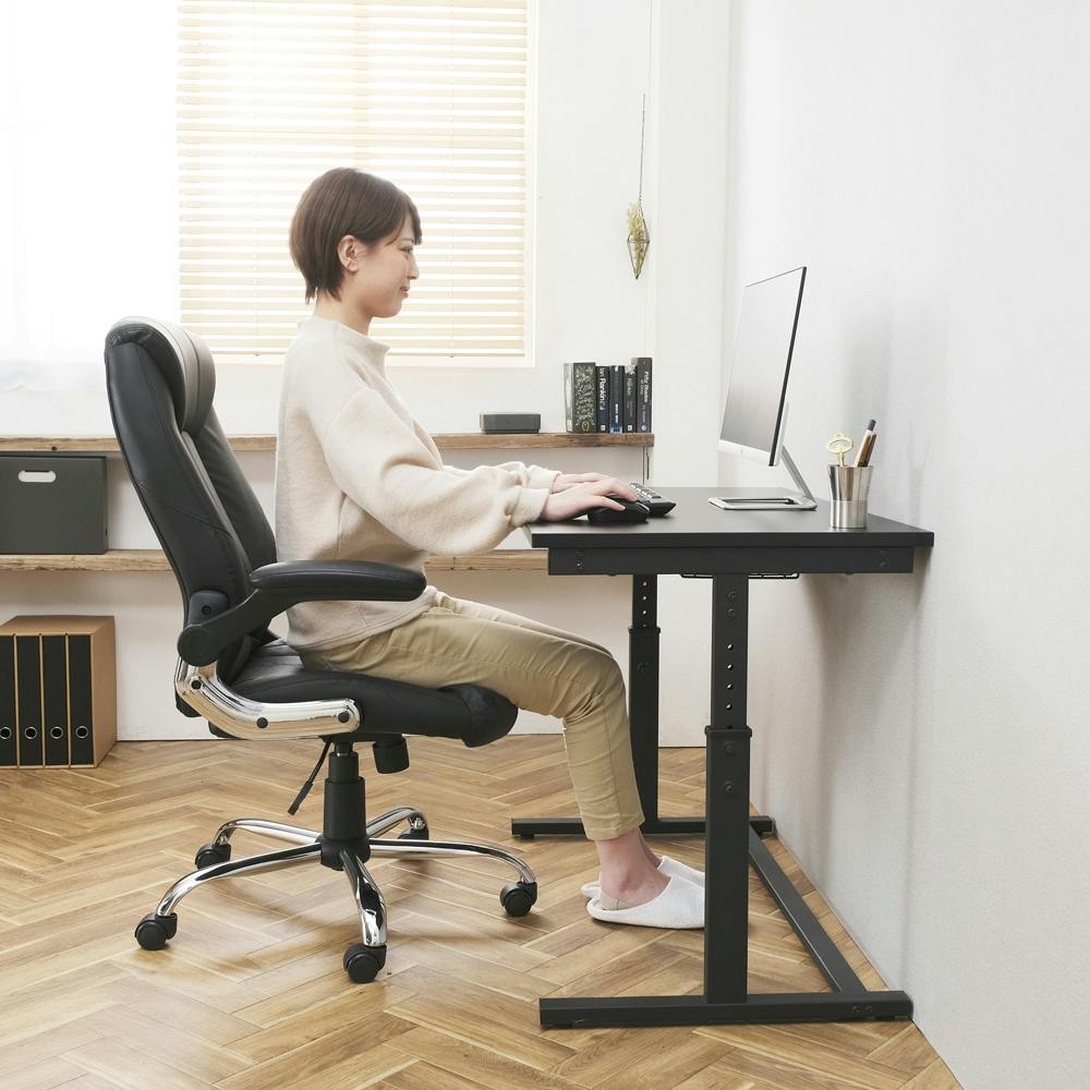 ボリュームのあるクッションで長時間座っても疲れにくいレザーチェアです。ゆったり幅で肘を置きやすい跳ね上げ式アームレスト付です。デスクにも収納でき、省スペースなのでご自宅でもお使い頂けます。最大約15度ロッキングが可能、お好みの硬さに簡単に調節できます。キャスターにはポリウレタンの柔らかい素材を使用し、フローリングの傷を防止します。オフィスや書斎にマッチするシンプルなデザインで、カラーはお好みに合わせて3色から選べます。