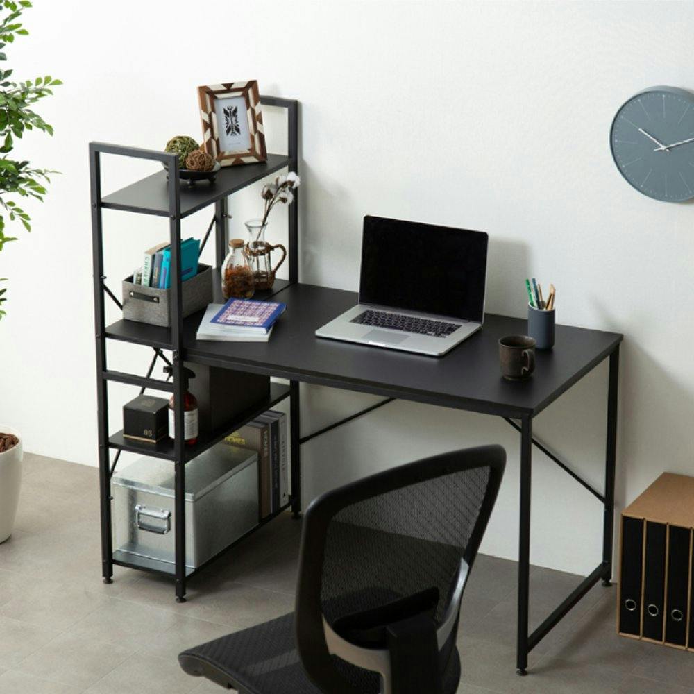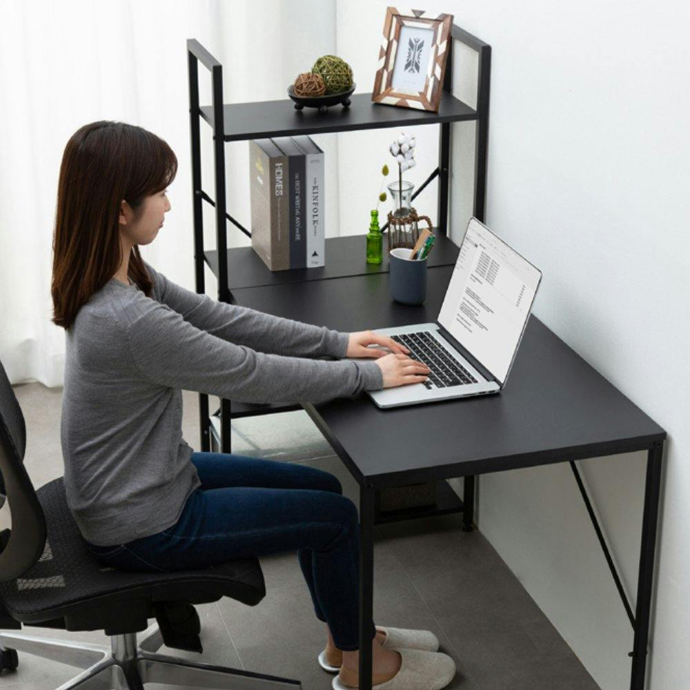 収納性抜群でリモートワークにも最適なラック付きデスクです。4段階のラックにファイルや小物、Wi-Fiルーターなどを収納でき、デスクを有効に活用できます。脚底にアジャスターがついているので、がたつきを防止します。天板には耐水性・耐熱性に優れたパーティクルボードを使用、汚れてもさっと拭けるのでお手入れが簡単です。 ●耐荷重:デスク天板:30kgf、 棚板:(1枚あたり)8kgf