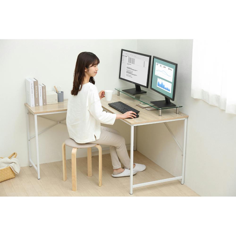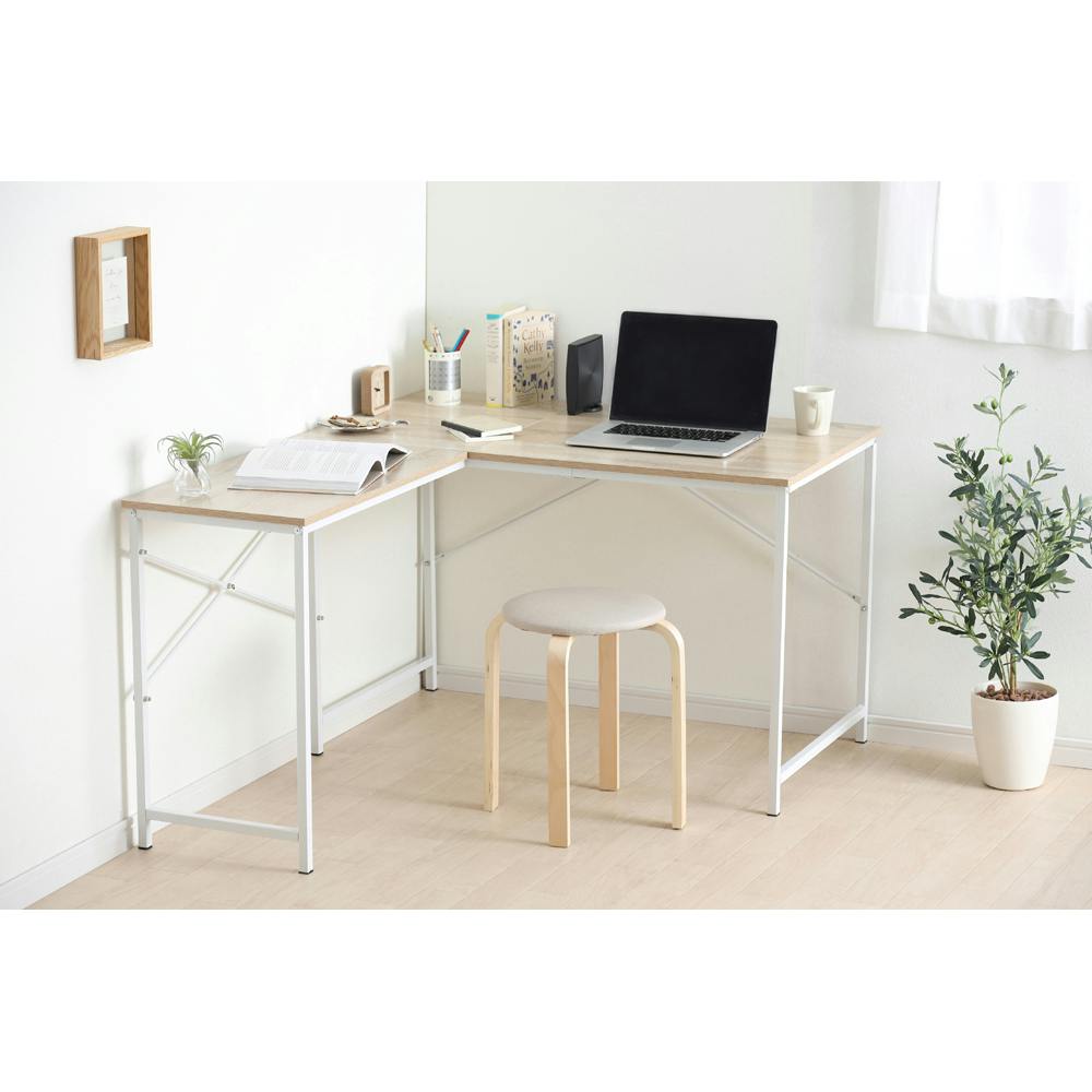 パソコンや資料も広げて作業ができ、左右のスペースをゆったり使えるL型デスクです。クロスバーでデスクの横揺れを最小限に抑えます。天板には耐水性・耐熱性に優れたパーティクルボードを使用、汚れてもさっと拭けるのでお手入れが簡単です。 ●耐荷重:天板a・b:1枚あたり30kgf、天板c:20kgf