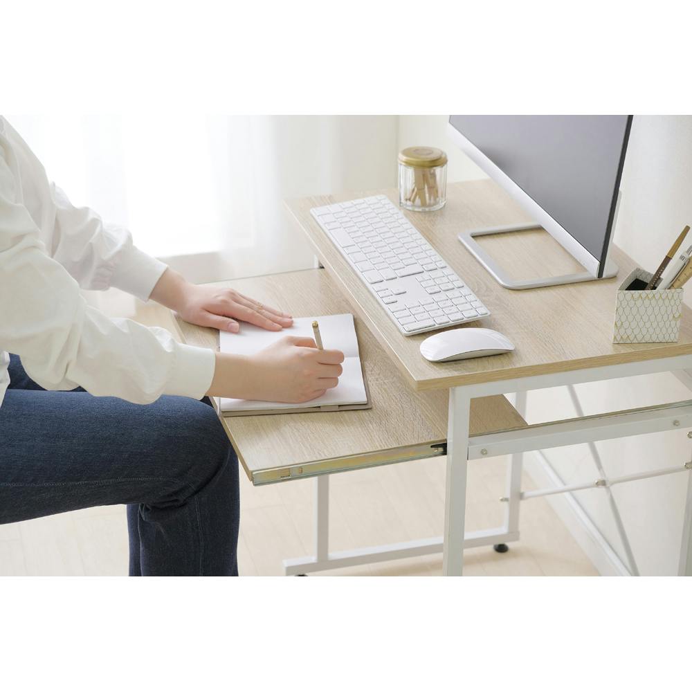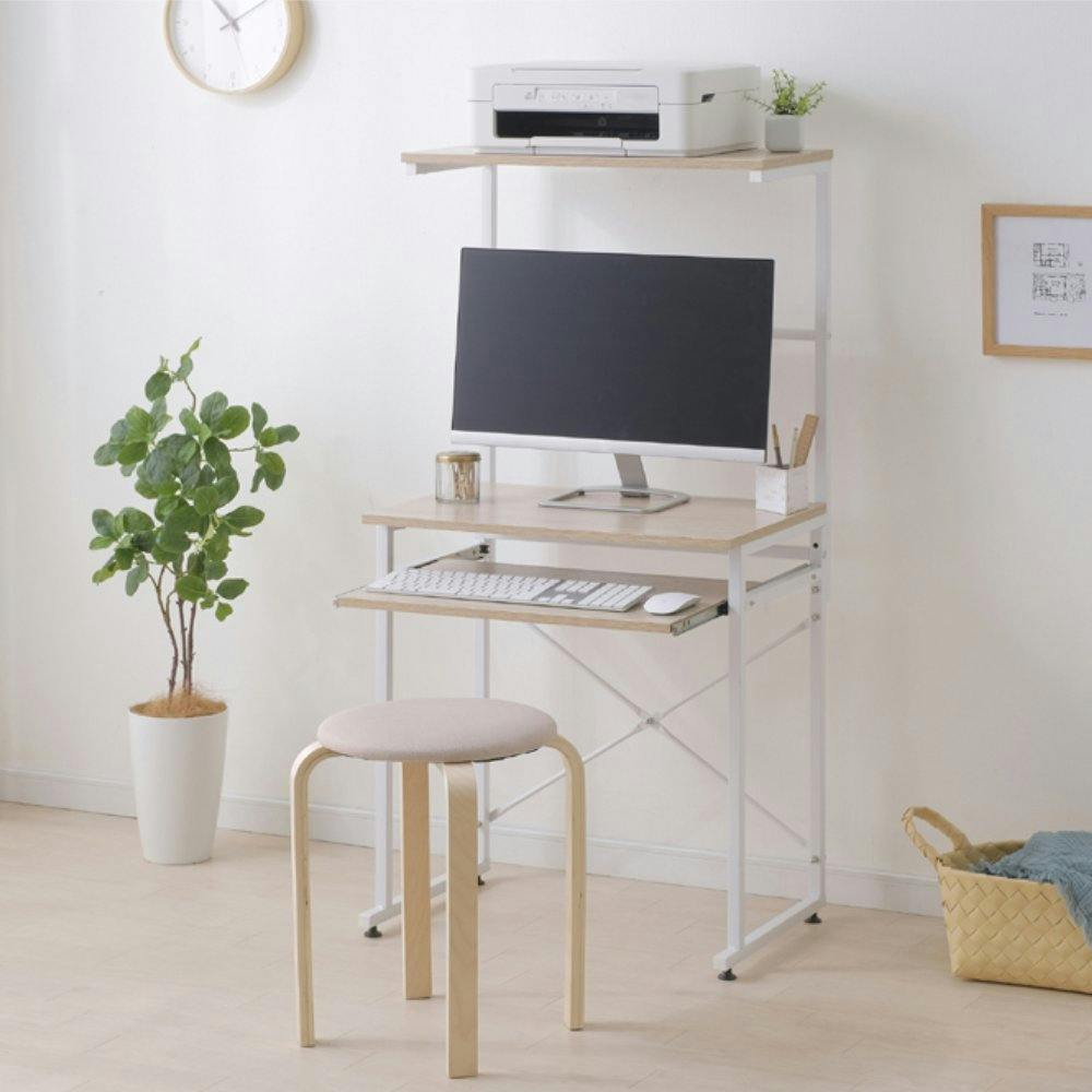 スペースが取りづらい場所でも有効活用できるタワーデスクです。上部収納棚にWi-Fiルーターやパーソナルシュレッダーなど小物を収納できます。マウスやキーボードの収納のほか、資料やタブレットを使いながらの作業などに便利なスライダー収納付です。天板には耐水性・耐熱性に優れたパーティクルボードを使用、汚れてもさっと拭けるのでお手入れが簡単です。 ●耐荷重:天板:15kgf、上部棚板:8kgf、スライド棚板:5kgf