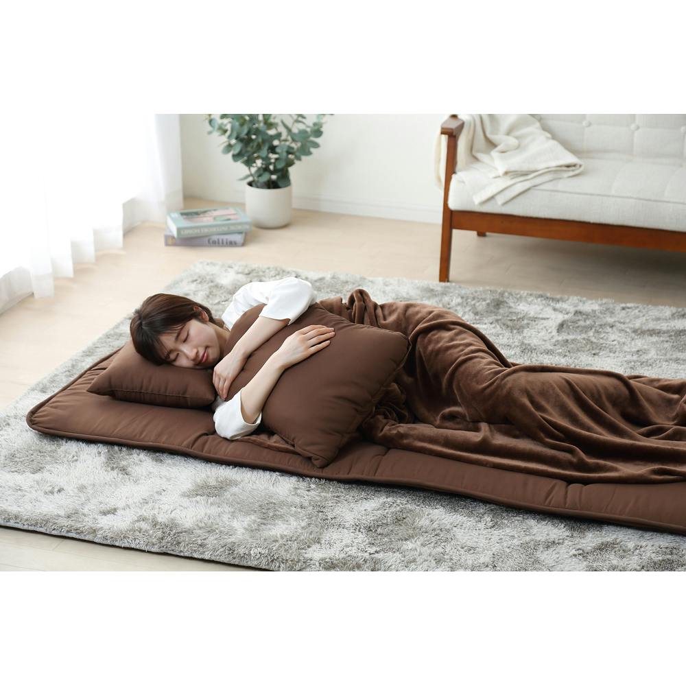 毛布もついているコンパクトサイズの布団5点セットです。お昼寝やレジャー、車中泊、緊急時の備えにもおすすめです。収納や持ち運びに便利なバッグ付きです。掛け布団と敷きマットはセミシングル、毛布はシングルサイズです。 ●セット内容:掛け布団、敷きマット、枕、毛布、収納バッグ ■掛け布団 ◯商品サイズ(約):1,200×1,850mm ◯主要材質:側生地:ポリエステル100%、詰めもの:ポリエステル100% ◯目付け(約):80g/平方メートル ◯詰めもの重量(約):390g