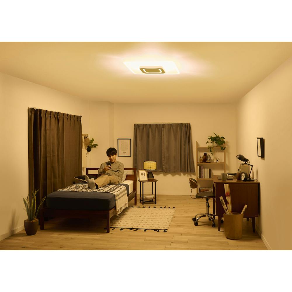 ●演色性:Ra85●設計寿命:40,000時間●光色:電球色~昼光色相当●定格電源電圧:AC100V●定格電源周波数:50Hz/60Hz●消費電力:45.6W●器具光束:5200ルーメン(最大点灯時)●適用畳数:~12畳用●待機電力:0.5W●発光効率:114.0ルーメン/W●調光/調色:10/10段階●おやすみタイマー:15/30分
