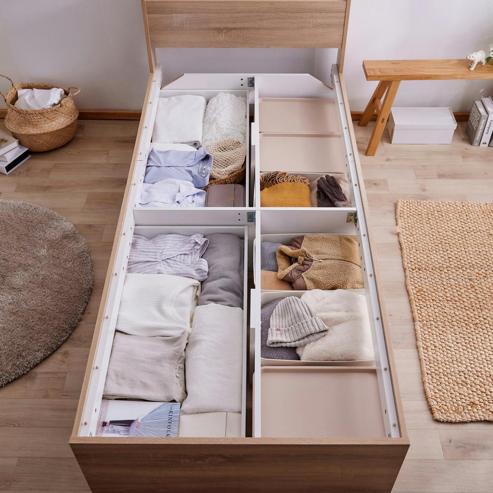 大容量のベッド下収納にこだわった宮付きのベッドです。引き出しの深さは約24cmと深型で、1個あたり約105Lの収納が可能です。引き出しの取り付け位置は選択可能です。引き出しやすいキャスター付きです。ベッド下の引き出し収納以外のスペースも活用できるため、季節ものや使用頻度が低いお洋服なども収納可能です。床板はすのこ構造で通気性抜群です。湿気が溜まりにくく、オールシーズン快適です。簡単に取り外せます。ヘッドボードはスマホやティッシュなどの小物が置けます。2口コンセント付きです。
