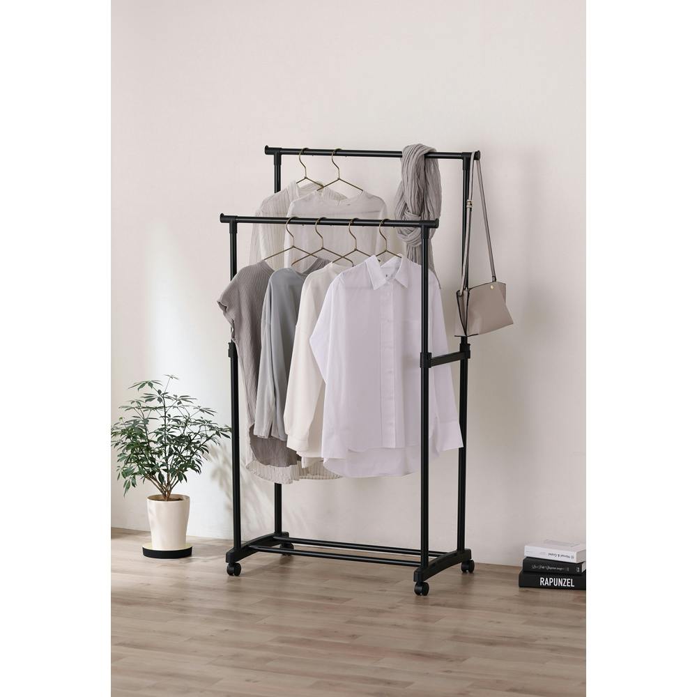 ブラック塗装仕上げでインテリアに馴染みやすいパイプハンガーです。安定感抜群で、たくさん掛けられます。ハンガーパイプの高さは約87.5~150cmの間で、無段階調整可能です。服の丈に合わせて、ストッパーをゆるめて伸縮させ、高さを固定できます。ハンガー下のスペースは収納物やボックスなどが置け、空間を有効活用できます。キャスター付きで移動がスムーズに行えます。ハンガーだけでなく、キャスターなどのパーツもすべてブラックで統一しています。お客様組み立てとなります。工具不要です。