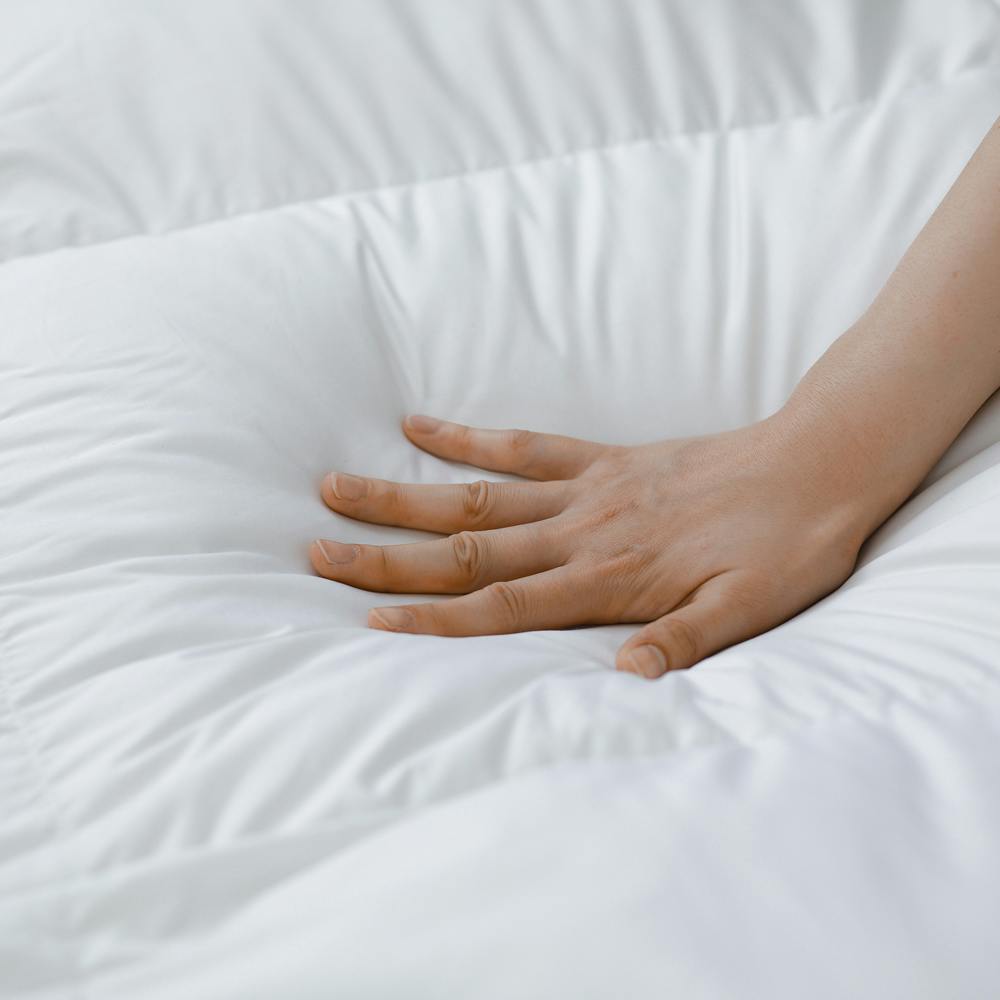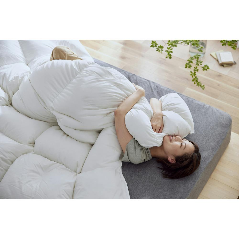 ホワイトダックダウンを90%配合した羽毛ふとんです。側生地は吸湿発熱効果があり、身体から発する水分を吸湿し熱を生み出します。発熱により暖まった空気を羽毛が保温し、あたたかく快適です。羽毛は消臭、抗菌防臭加工が施されています。側生地は桃の皮の表面のような風合いを持つピーチスキン加工で、柔らかくなめらかな肌触りです。制菌、抗カビ加工が施されていて、清潔を保てます。立体キルト加工を採用しています。表生地と裏生地の間にマチをつけて、立体的に区切れている構造です。
