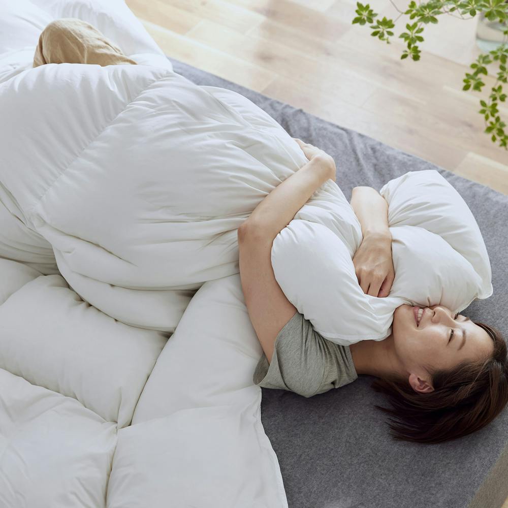 ホワイトダックダウンを90%配合した羽毛ふとんです。側生地は吸湿発熱効果があり、身体から発する水分を吸湿し熱を生み出します。発熱により暖まった空気を羽毛が保温し、あたたかく快適です。羽毛は消臭、抗菌防臭加工が施されています。側生地は桃の皮の表面のような風合いを持つピーチスキン加工で、柔らかくなめらかな肌触りです。制菌、抗カビ加工が施されていて、清潔を保てます。立体キルト加工を採用しています。表生地と裏生地の間にマチをつけて、立体的に区切れている構造です。