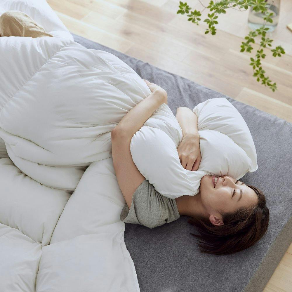 ホワイトダックダウンを90%配合した羽毛ふとんです。側生地は吸湿発熱効果があり、身体から発する水分を吸湿し熱を生み出します。発熱により暖まった空気を羽毛が保温し、あたたかく快適です。羽毛は消臭、抗菌防臭加工が施されています。側生地は桃の皮の表面のような風合いを持つピーチスキン加工で、柔らかくなめらかな肌触りです。制菌、抗カビ加工が施されていて、清潔を保てます。立体キルト加工を採用しています。表生地と裏生地の間にマチをつけて、立体的に区切れている構造です。