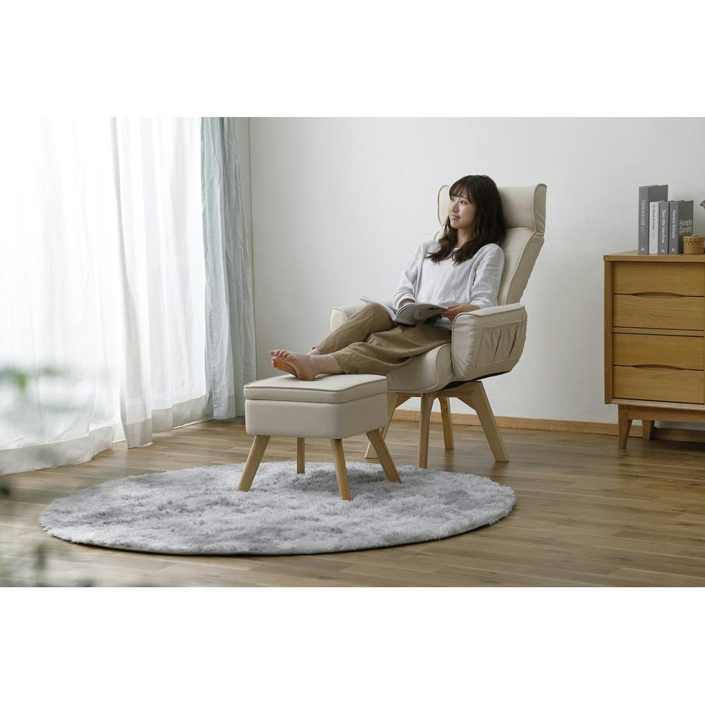 脚部に天然木を使用した収納付きのオットマンです。レザー調生地を使用しています。お部屋に高級感を与えます。収納スペースは小物収納に便利です。回転チェアと併用する、オットマンとして使用できます。足を伸ばしくつろげます。単体で1人掛けスツールとしてもお使いいただけます。また回転チェアの横にサイドテーブルとして置き、スマホや本などが置けます。座面下の高さも十分にあり、お掃除もラクに行えます。脚を取り付けるだけの簡単組み立てです。