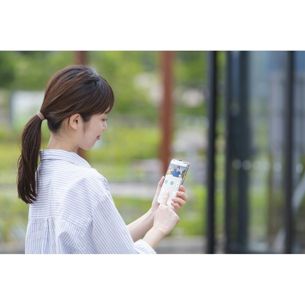 モニター親機をWi-Fi※に接続することで、外出中の急な来訪者でもスマートフォンで映像を見ながら対応することができます。 ※Wi-Fiは、Wi-Fi Allianceの登録商標です。