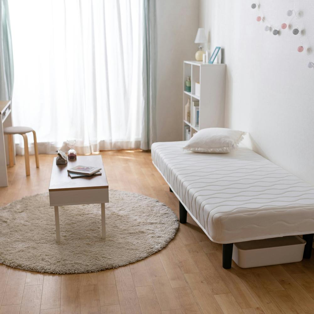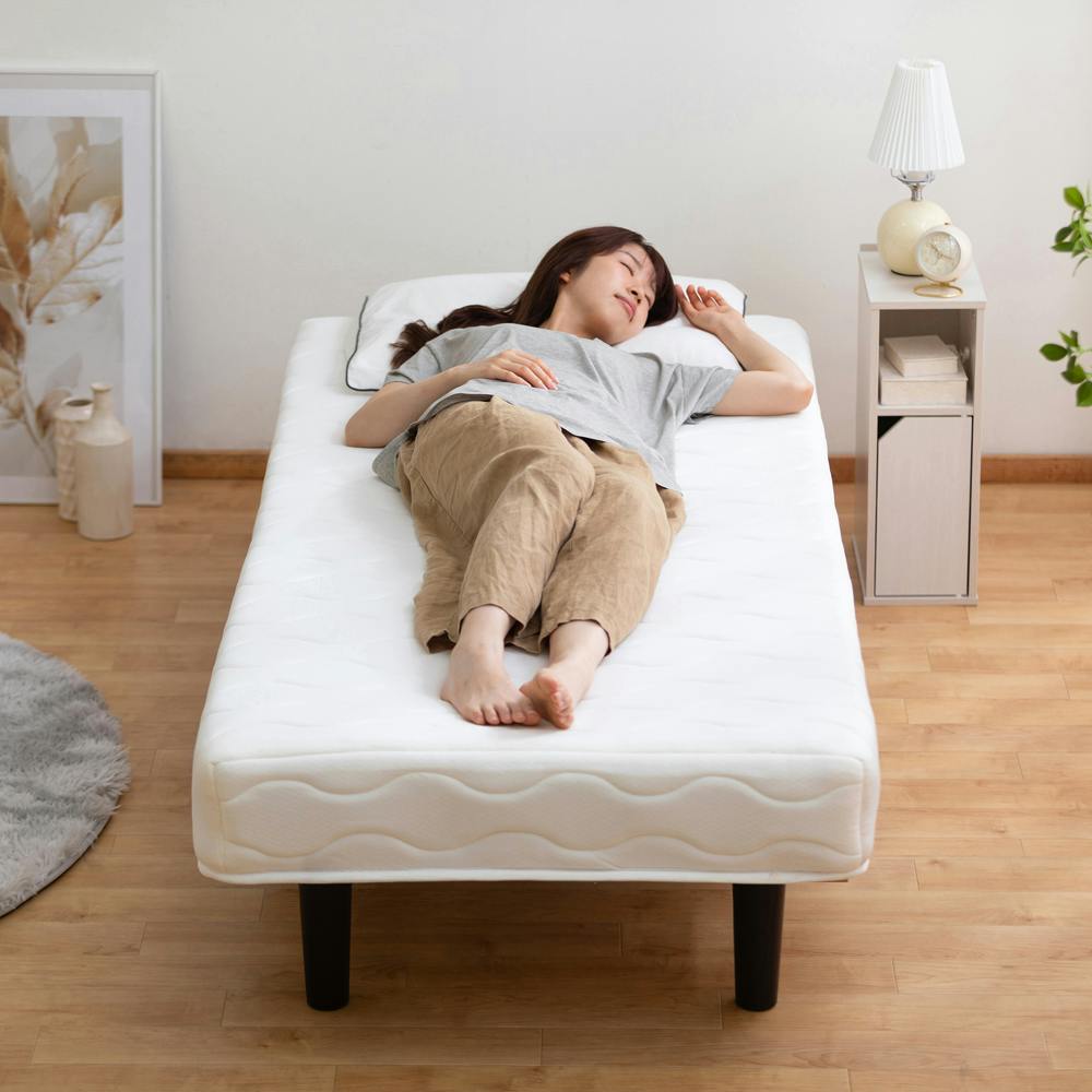 ベッド下の高さは約20cmあり、空間を有効活用できるため収納スペースとして使用できます。お客様組み立てとなります。木製パーツは組み立て番号付きです。 ●ベッド部サイズ(約):740×1,650×254mm ●脚の長さ・ベッド下の高さ(約):200mm ●マットレスサイズ(約):800×1,800×170mm ●マットレスの厚み(約):170mm ●マットレスの硬さ(約):かため ●コイル数(約):208個 ●スプリング線径(約):2.2mm ●最大使用者体重(約):90kg
