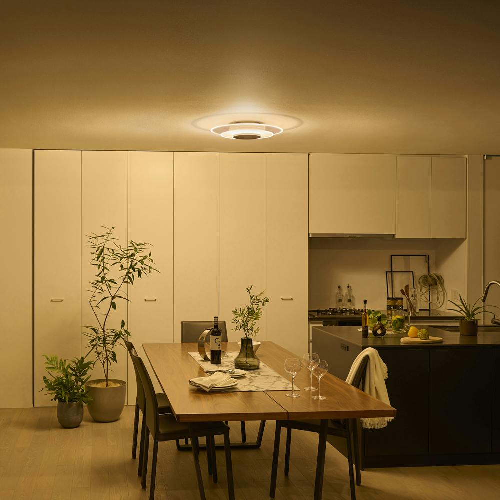 2連パネルならではの存在感で、インテリア性のあるデザインのLEDシーリングライトです。導光板によりLEDの光が均一に届き、LED特有のまぶしさがなく目に優しい光を実現しました。リモコン操作で、調光10段階+調色11段階の切り替えができ、お好みの明るさを記憶させ記憶した明るさで再現点灯することができます。2連パネルだから再現できる間接光で、全灯時は天井面まで明るく、調光時は間接光でおしゃれに空間を演出できます。ゆらぎ機能搭載。上下のパネルが交互に明暗を繰り返し、ゆらぎを表現します。