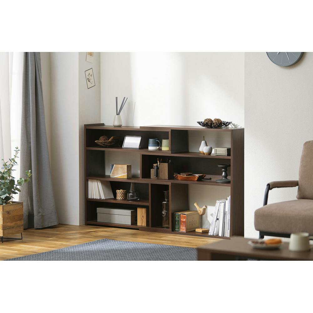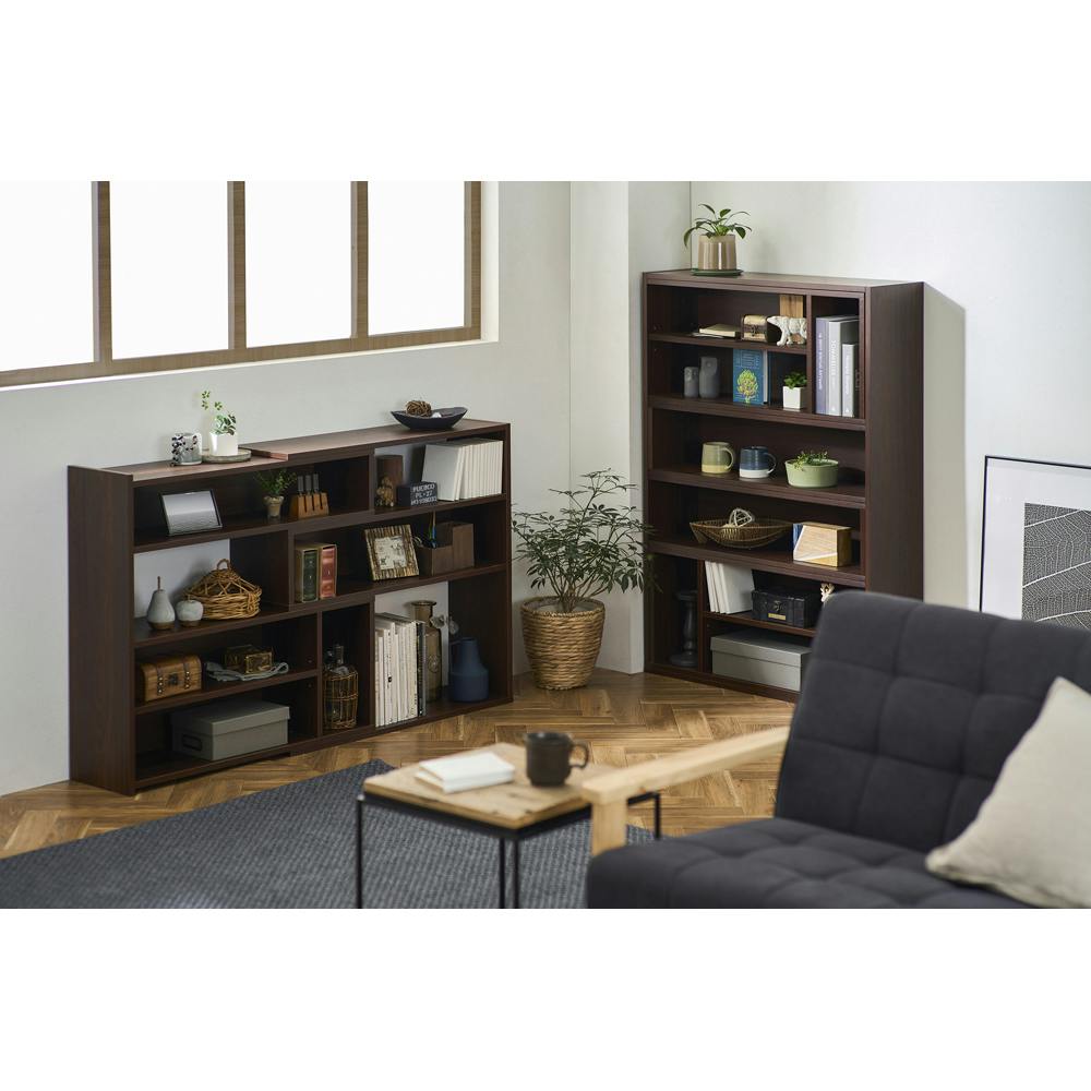 お部屋のスペースに合わせて伸縮可能なウッドスライドラックです。幅約83~139cmまで伸縮できます。書籍から小物などたっぷりと収納可能です。またディスプレイラックとしても使用できます。高さを調節できる可動棚が1か所あります。収納物に合わせて自由に調整できます。可動部2か所の板裏面には溝とストッパーがあり、スライドしても本体と可動部がずれにくくなっています。お部屋のコーナーに置いて、L字型に設置も可能です。ボックス部は両面化粧紙仕様なので、お部屋の間仕切りとしてもお使いいただけます。
