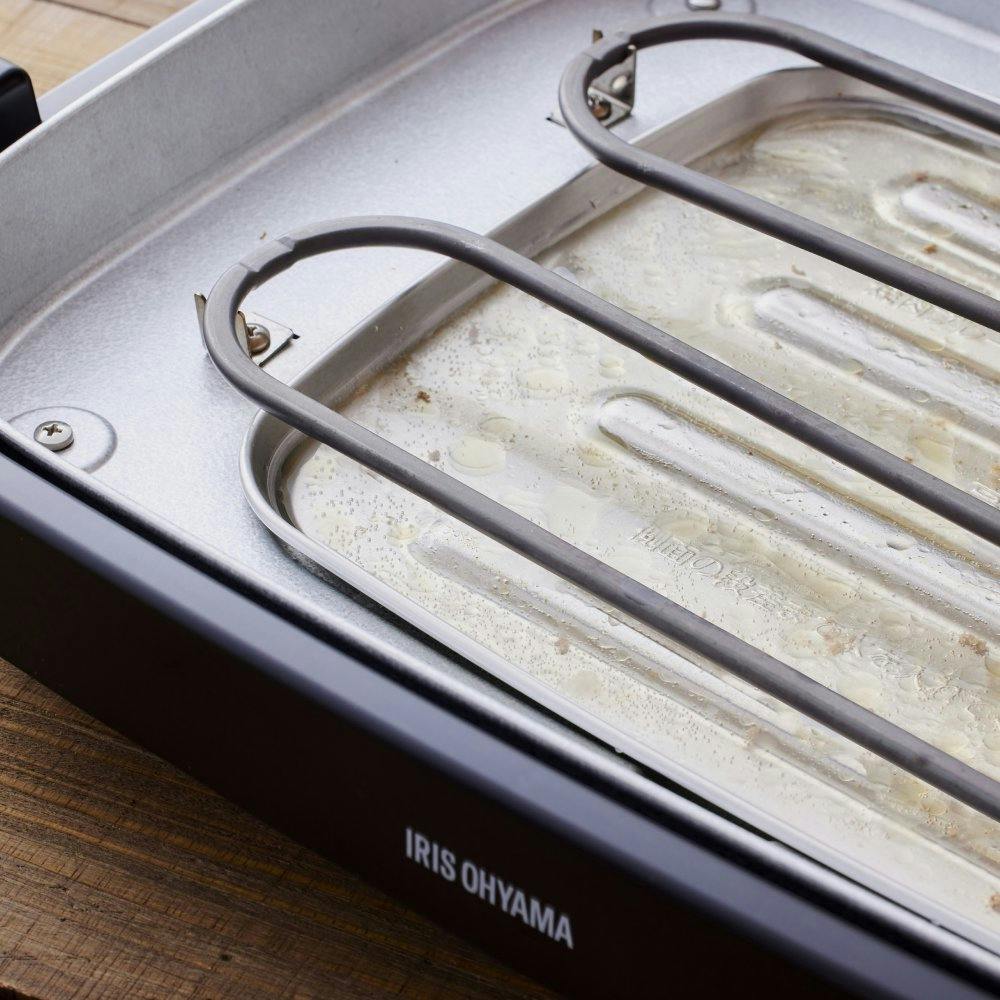 (ヒーターユニット、コントローラー、しゃ熱板は水洗い不可) 穴あきプレートで油を落とすため、煙が発生しにくく、また油の飛び散りも少ないので片付けが簡単です。