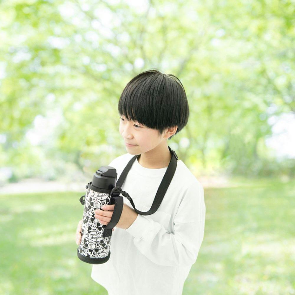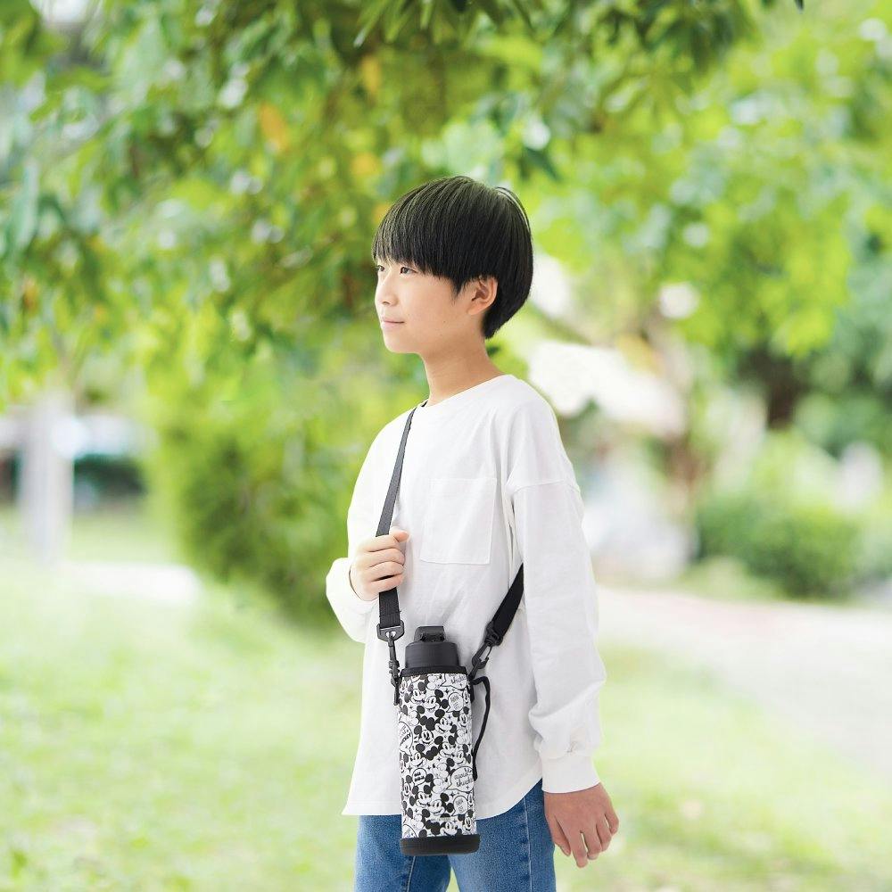 人気キャラクター、ディズニーデザインのステンレスケータイボトルです。ポーチ付きです。そのまま飲める直飲みタイプで、通学・習い事・スポーツなど日々の水分補給に最適なダイレクトボトルです。片手でロックを解除し、ワンタッチオープンで簡単にふたを開けることができます。真空二重構造のため冷たさを保ち、飲み物を保冷できます。口径は約5cmで、大きな氷もラクラク入ります。ポーチを外すとポーチとは異なるデザインのボトルになります。肩から掛けられるストラップ付きポーチは持ち運びに便利です。