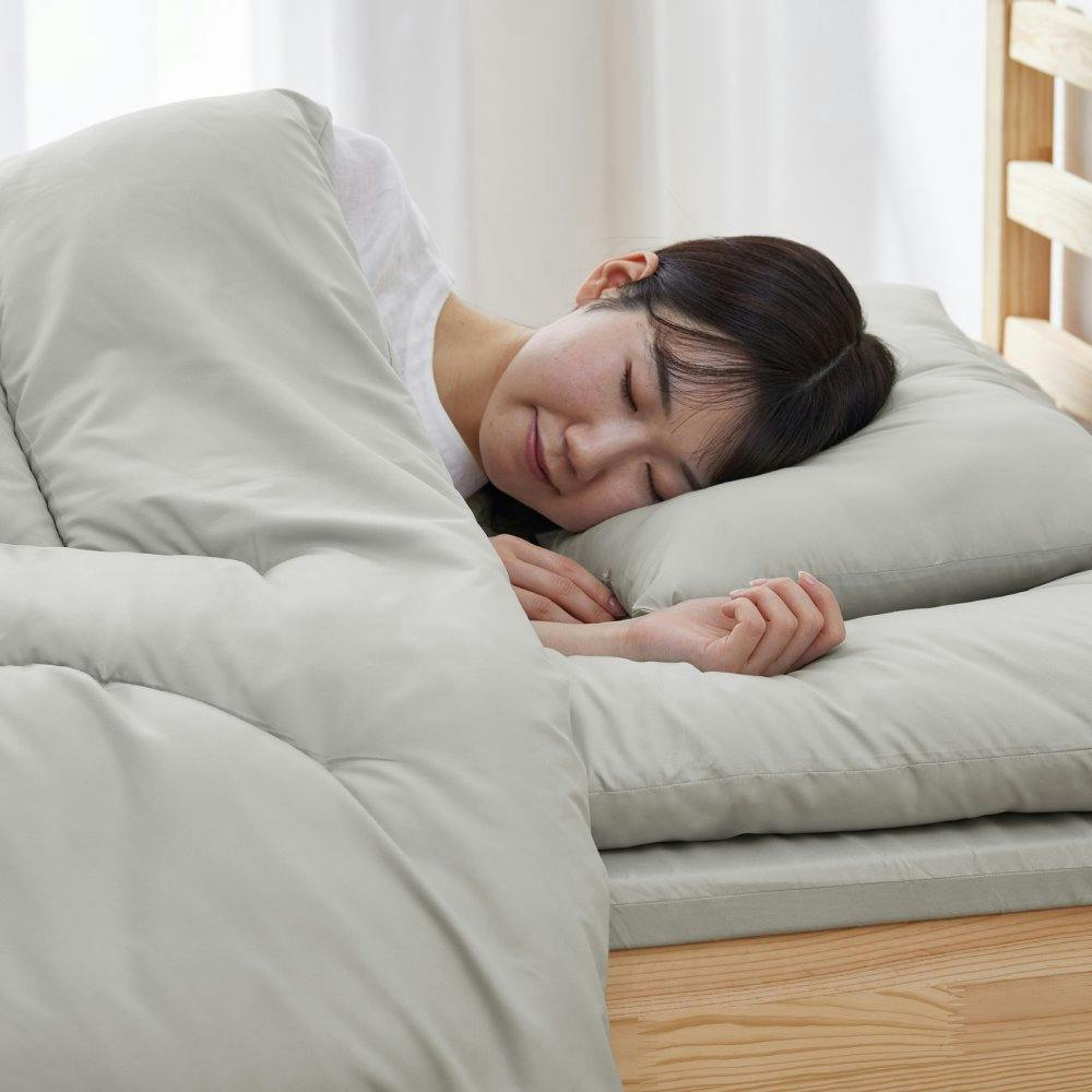●セット内容:掛け布団、敷き布団、枕、マットレス、収納バッグ ■掛け布団 ◯商品サイズ(約):1,500×2,100mm ◯商品重量(約):1.7kg ◯主要材質:側生地:ポリエステル100%、詰めもの:ポリエステル100% ◯目付け(約):88g/平方メートル ◯ループ数:6か所 ■敷き布団 ◯商品サイズ(約):950×1,980mm ◯商品重量(約):2.15kg ◯主要材質:側生地:ポリエステル100%、詰めもの:ポリエステル100% ◯目付け(約):88g/平方メートル