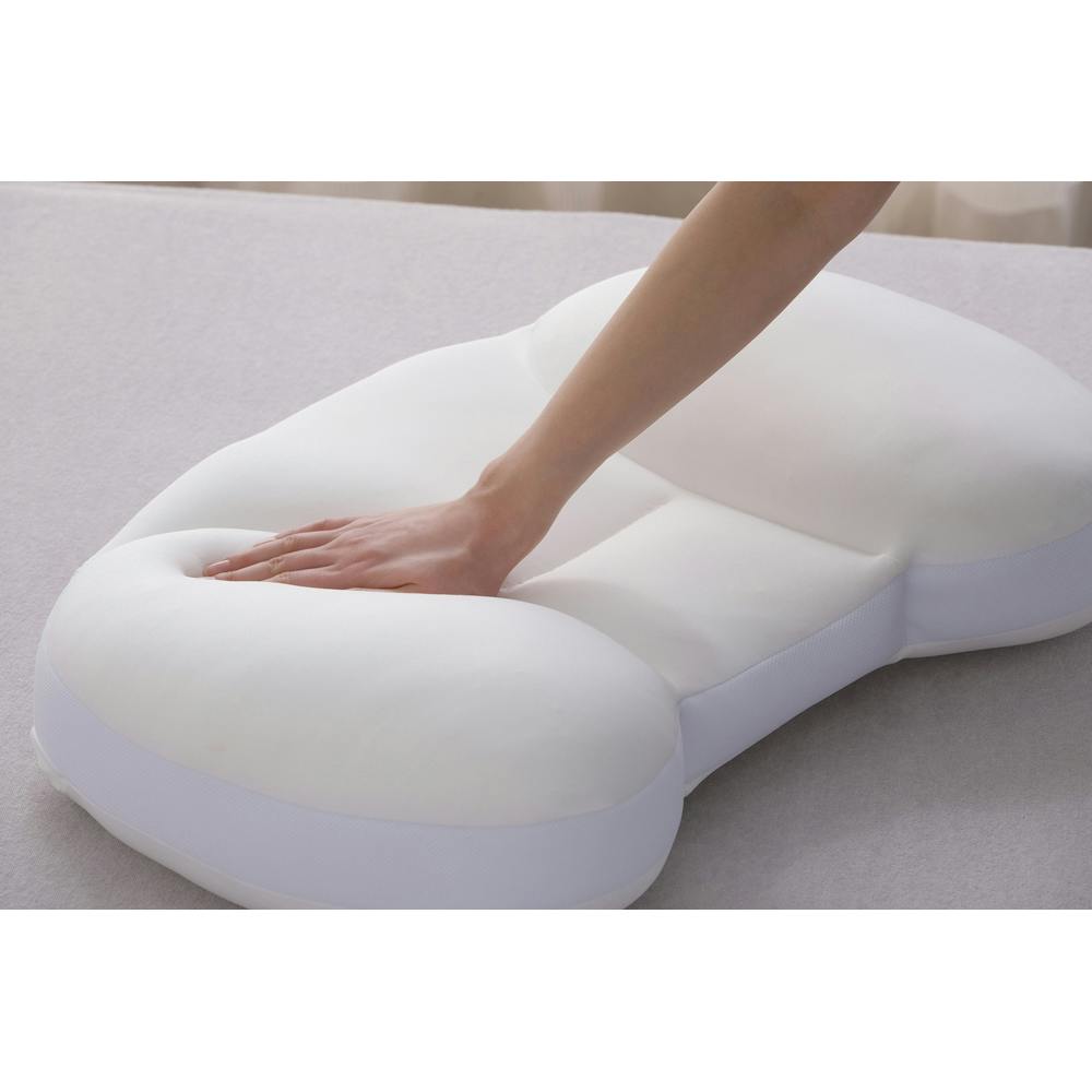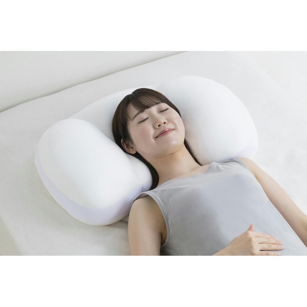 頭と首全体にフィットし快適な睡眠へ導く、横向き寝まくらです。充填物を部位に合わせて配合し、包み込まれるようなフィット感があります。首から顎まで支えるので横向き寝がラクです。まくらの左右はしっかり、もちもちとした触感です。仰向け寝も心地いい、ゆったりワイドサイズです。首元はふんわり、頭部はやわらかくなっています。耳までフィットするので気持ちよくお使いいただけます。中材は極小発泡ビーズ、低反発ウレタン、ポリエステルわたを使用しています。
